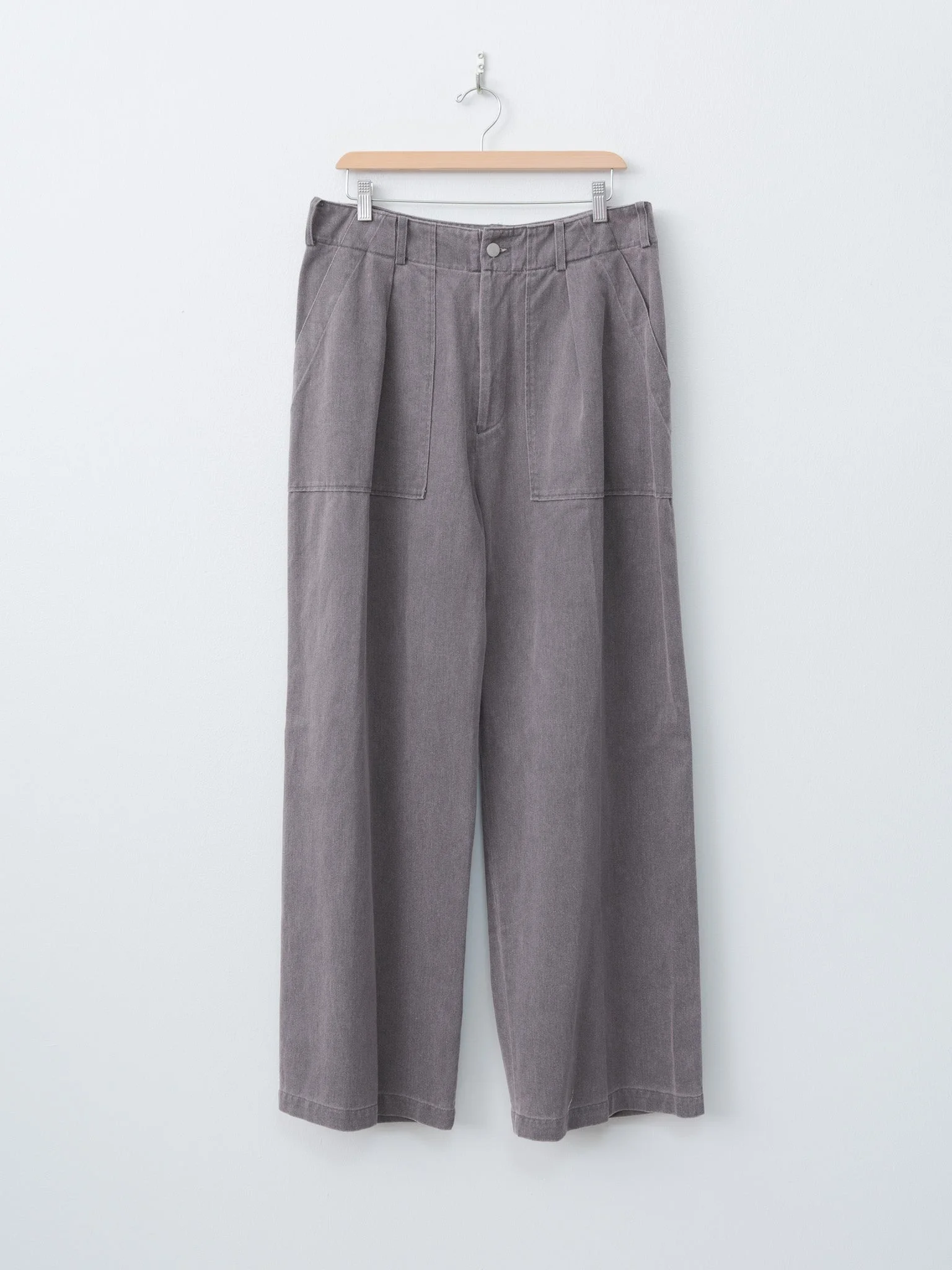 Wide leg baker trousers made from pigment-coated cotton. The fabric was originally coated entirely in black pigment which was partially removed through washing, and then garment-dyed for a layered and nuanced final color. The result is a smokey, deep-tone pink. Details include a wide fit with a single front tuck, patch pockets and adjustable tabs at the waist. - Made in Japan - 100% Cotton - Available in Dusty Pink - The model is 6'1"/185 cm and wears size 3/M