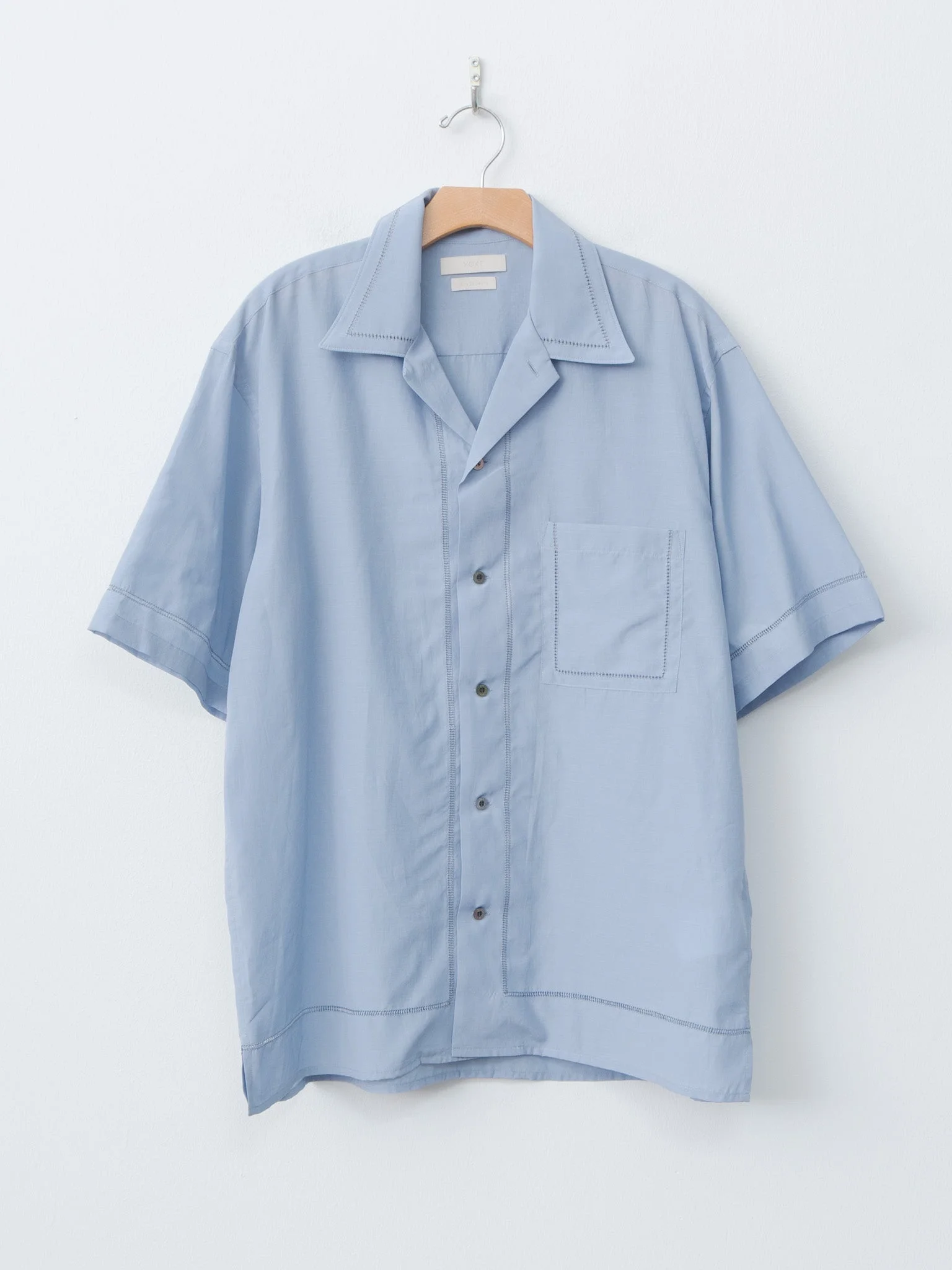 An open collar short sleeve shirt from Yoke featuring intricate stitching along the collar, cuffs, chest pocket and body. It is crafted from a cotton-acetate poplin that has a subtle sheen and a crisp, cool hand feel. The fabric is double-bath dyed at a specialist dye house in Hokuriku, Japan, resulting in refined colors and is suitable for home washing. Details include shell button front, side split hem and side back pleats. Relaxed fit. - Made in Japan - 65% Cotton, 35% Acetate - Available in Pink, Sax Blue - The model is 6'1"/185 cm and wears size 4/L