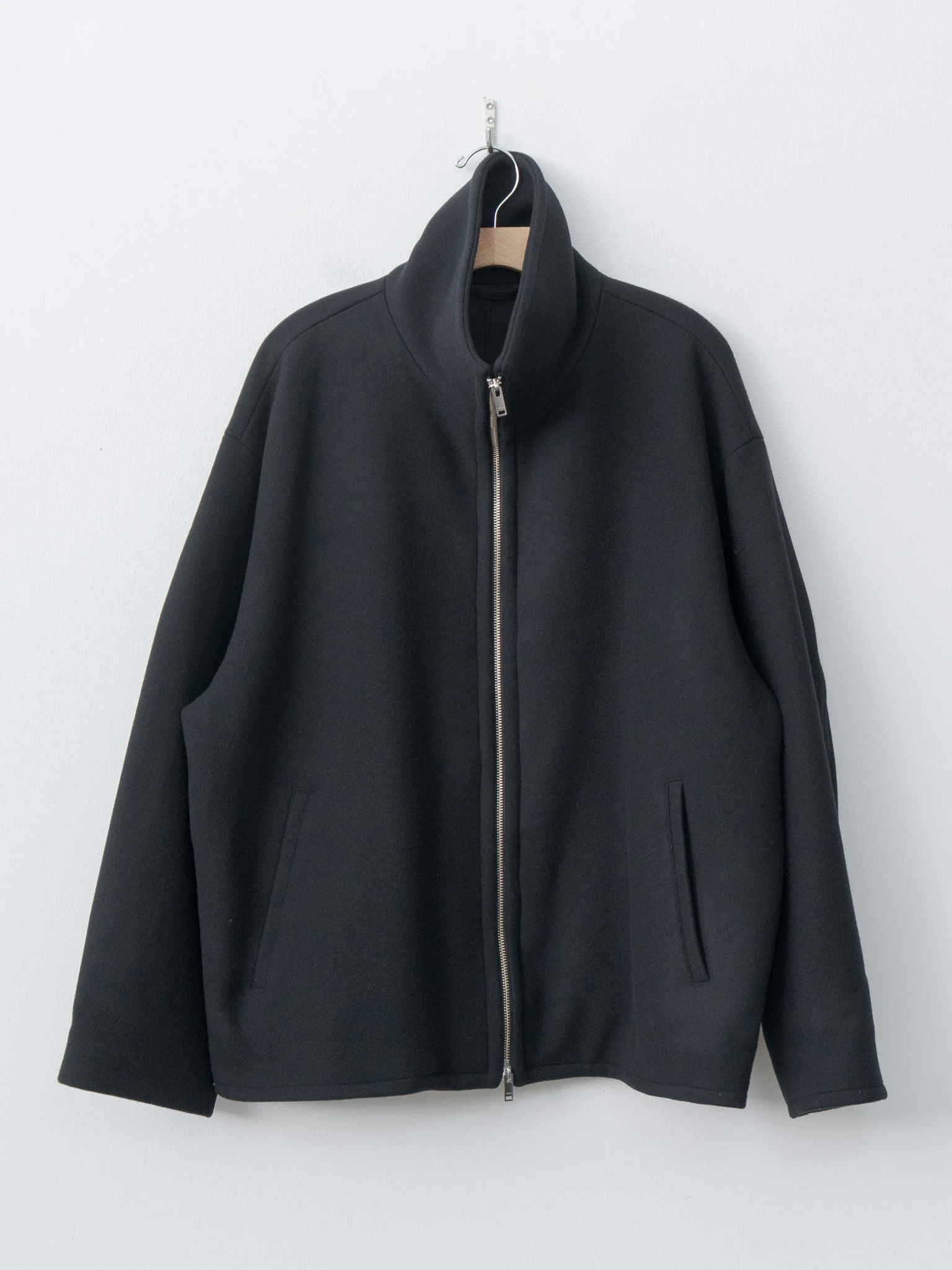 A clean, minimal blouson with a boxy fit, crafted from Super 140’s melton wool—a fabric that offers structure and warmth while remaining lightweight and comfortable. It features a large stand collar that can be worn upright or folded down, a two-way zip front, and adjustable cuffs and hem with snap buttons. - Made in Japan - 90% Wool, 10% Nylon - Available in Brown, Black - The model is 6'1"/185cm and wears size 4/L