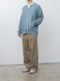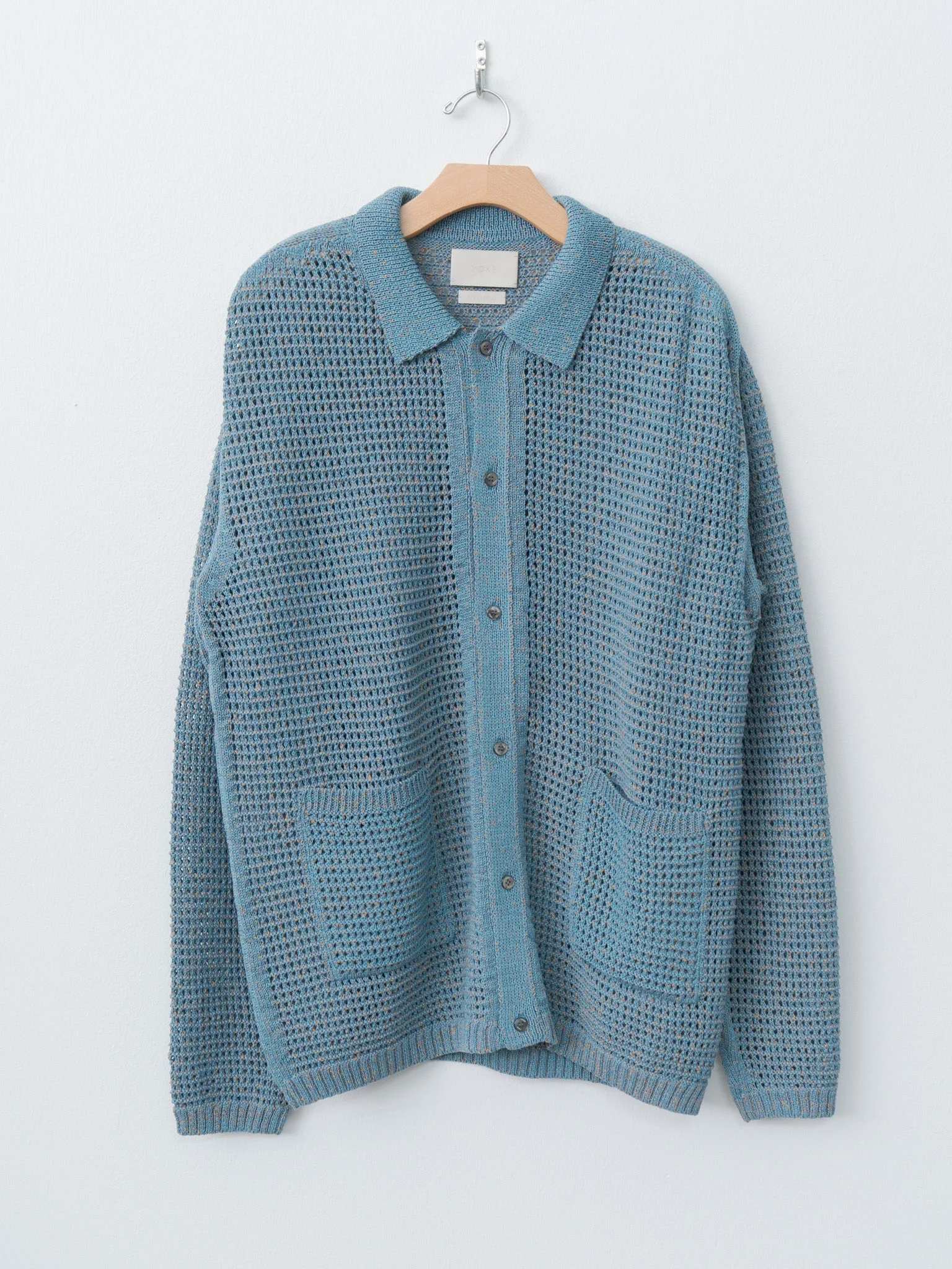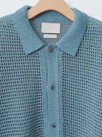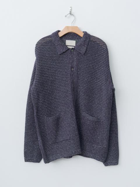 This mesh knit shirt cardigan is crafted from Gima cotton, known for its crisp and cool texture. The slub yarn combines two dyed tones, and an additional third color is layered in the knit to produce a nuanced, deep color mix. The mesh structure allows airflow and makes for a great warm weather layer. Other details include shell buttons, front patch pockets, and a wide fit silhouette that blends shirt and cardigan elements. - Made in Japan - 100% Cotton - Available in White, Blue, Purple - The model is 6'1"/185 cm and wears size 4/L