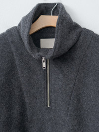 The Wool Fleece Half Zip Pullover is a wide-fit, unlined pullover crafted from soft wool fleece that balances warmth and lightness. Made with recycled wool in a special knit structure, both sides are brushed to create a voluminous texture that traps air while remaining lightweight. Details include a curved front panel, metal zipper, kangaroo pockets, and elasticated cuffs. - Made in Japan - 66% Wool, 26% Polyester, 4% Nylon, 4% Other - Available in Brown, Charcoal - The model is 6'1"/185cm and wears size 4/L