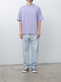 A short sleeve t-shirt featuring a distinctive yoke across the back, which creates a set-in sleeve appearance on the front and dolman sleeves on the back. The fabric is a high-gauge blend of suvin and organic cotton, finished with a bio-wash that adds a soft and silky texture. Relaxed fit. - Made in Japan - 100% Cotton - Available in White, Lavender - The model is 6'1"/185 cm and wears size 4/L