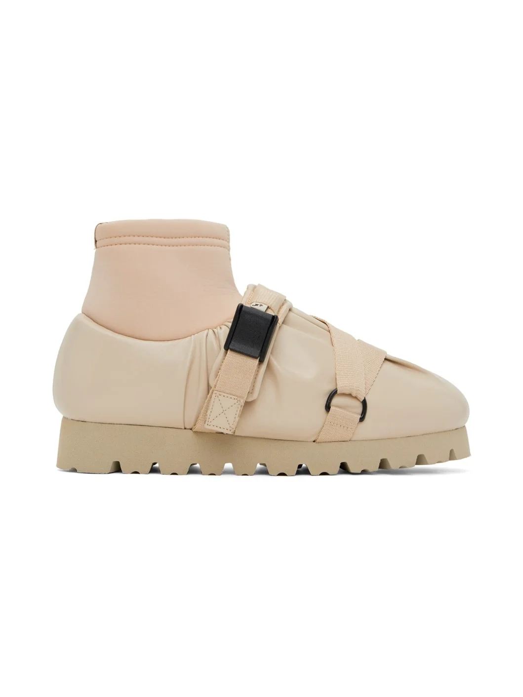 Ankle-high padded grained faux-leather boots in beige. · Gathering throughout · Criss-crossing cinch strap at vamp · Bonded jersey sock-style collar · EVA foam rubber platform midsole · Treaded rubber sole · Platform: H1.5" Supplier color: Beige Upper: synthetic, textile. Sole: rubber. Made in Portugal 241844M231003