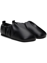 Buffed faux-leather slip-on loafers in black. · Square toe · Gathering at collar · Pull-loop at heel collar · Logo embossed at padded footbed · Grained faux-leather lining · Rubber sole Supplier color: Black Upper: synthetic. Sole: rubber. Made in Portugal 251844M231005