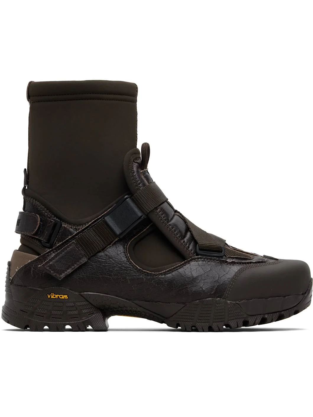 High-top cracked faux-leather and neoprene sneakers. · Cinch strap at vamp · Pull-loop at quilted padded tongue · Pull-loop at heel collar · Logo-embossed velcro strap at heel counter · Treaded Vibram® rubber sole Supplier color: Cracked coffee Upper: textile, synthetic. Sole: rubber. Made in Portugal 252844M236003