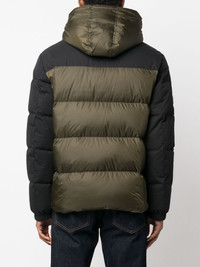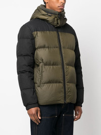 detachable-hood down jacket Highlights - Sage green/black - Duck down - Padded design - Colour-block design - Detachable hood - Front zip fastening - Long sleeves - Elasticated cuffs - Straight hem - Two side slit pockets Made in France Composition Outer: Lamb Fur 100%, Polyester 100%, Polyamide 100% Lining: Duck Down 95%, Duck Feathers 5% SIZE & FIT Model measurements Height 6 ft 1 in(1.85 m) Bust/Chest 38.58 in(98 cm) Hips 37 in(94 cm) Waist 30.31 in(77 cm) FittingInformation Designed for a regular fit, allowing for a comfortably loose fit throughout the body The internal drawstring at the hem allows for fitted preferences Made from a padded non-stretch fabric, giving it no natural elasticity This piece fits true to size – take your usual size