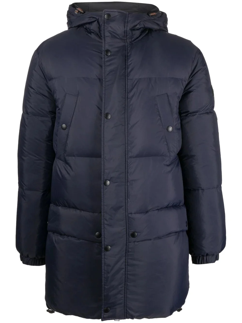 hooded feather-down padded jacket navy blue feather down padded design classic hood front button fastening two slit pockets at the chest long sleeves straight hem Made in France Composition Lining: Down 95%, Duck Feathers 5% Outer: Polyamide 100% SIZE & FIT Model measurements Height 6 ft 2 in(1.87 m) Bust/Chest 36.41 in(92.5 cm) Hips 37 in(94 cm) Waist 29.52 in(75 cm) FittingInformation This piece fits large – you might want to get one size down Cut for a loose fit Made with a mid-weight non-stretch fabric Washing instructions Machine Wash