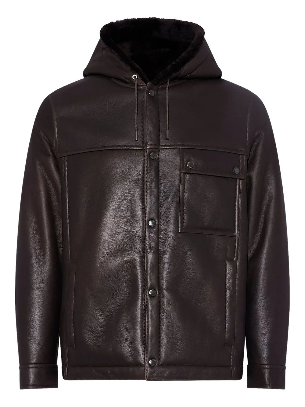 hooded shearling jacket Highlights - Dark brown - Merino shearling - Snap button fastening - Flap pockets - Hooded neckline - Shearling hood lining Made in France Composition Lining: Sheep Skin/Shearling 100% Outer: Lamb Skin 100% Washing instructions Specialist Cleaning