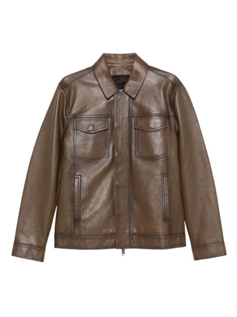 Pocket denim style leather jacket Highlights - Green - Lamb skin - Point collar - Front button fastening - Long sleeves - Chest flap pockets Made in France Composition Outer: Lamb Skin 100% Lining: Cupro 100% Inner: Cotton 90%, Organic Viscose 10% Washing instructions Read Manufacturer Guidelines
