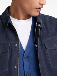 suede jacket Highlights - Navy blue - Front press-stud and zip fastening - Two chest flap pockets - Press-stud fastening cuffs - Full lining Made in France Composition Lining: Acetate 52%, Cupro 48% Outer: Lamb Suede 100%