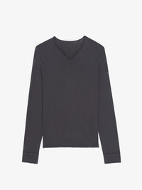 Long-sleeved henley t-shirt-style T-shirt. Description & details - Henley t-shirt-style T-shirt in 100% cotton - Henley t-shirt collar with 5 buttons - Long sleeves Model is 189 cm / 6' 2" and is wearing a size M This item fits true to size. Choose your usual size. Composition 100% Cotton* Care - Machine-wash inside out on a 30°C delicate cycle with similar colours - Air dry - Iron inside out at a maximum of 110°C, avoiding any customised details Product code: JMTN01641_DARK CHOCOLATE