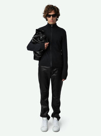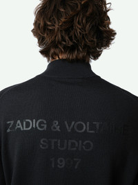 Long-sleeved high collar dark grey merino wool zip-up cardigan with Studio print on the back. Description & details - Men’s Nightmare anthracite merino wool cardigan - Zadig&Voltaire Studio 1997 print with distressed effect on the back - Thin funnel neck - Zip fastening - Long sleeves and ribbed edges - ZV signature at the bottom Model is 183 cm / 6' 0" and is wearing a size M This item is true to size. We recommend buying your usual size. Composition 100% WOOL MERINOS* Care - Hand-wash or machine-wash on a 20°C wool cycle with a maximum spin speed of 400 rpm - Do not wring - Air dry flat - Iron inside out at a maximum of 110°C, avoiding any customised details Product code: KMCA00228_NIGHTMARE