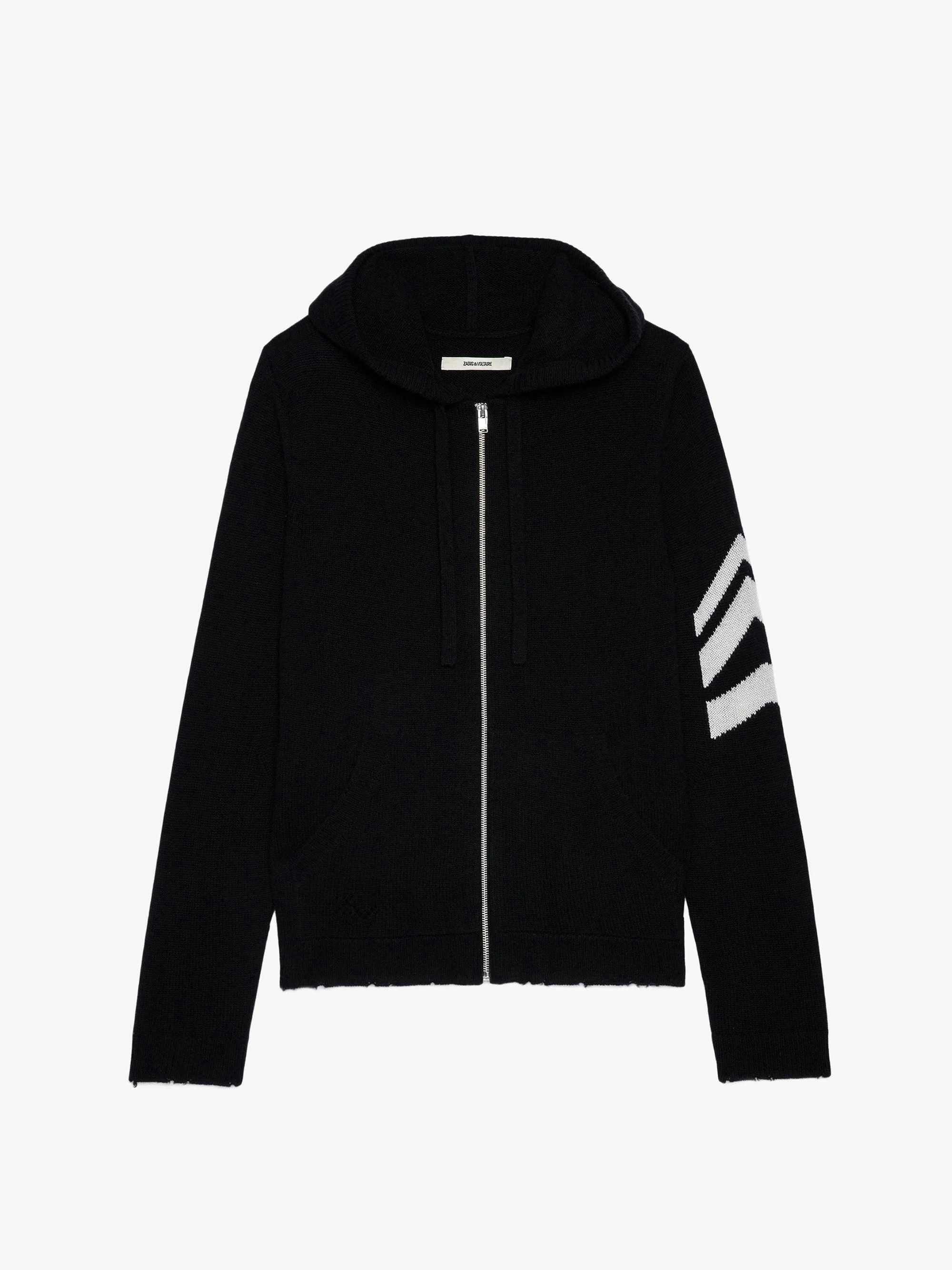 Long-sleeved black cashmere zip-up cardigan with hood and arrow on left arm. Description & details - Men's black cashmere cardigan - Jacquard intarsia arrow on left arm - Zip fastening - Drawstring hood - 2 pockets - Long sleeves and worn-effect ribbed edges Model is 189 cm/6'2" and is wearing a size M Model is 189 cm / 6' 2" and is wearing a size M This item is true to size. We recommend buying your usual size. Composition 100% CASHMERE Care Hand or machine wash your knitwear at 20°C in a pillowcase or washing bag. Do not use fabric softener or leave your knit soaking in water. The spin speed must not exceed 400 rpm. Dry flat on a towel away from direct sunlight and heat. Product code: KMCA00009_NOIR