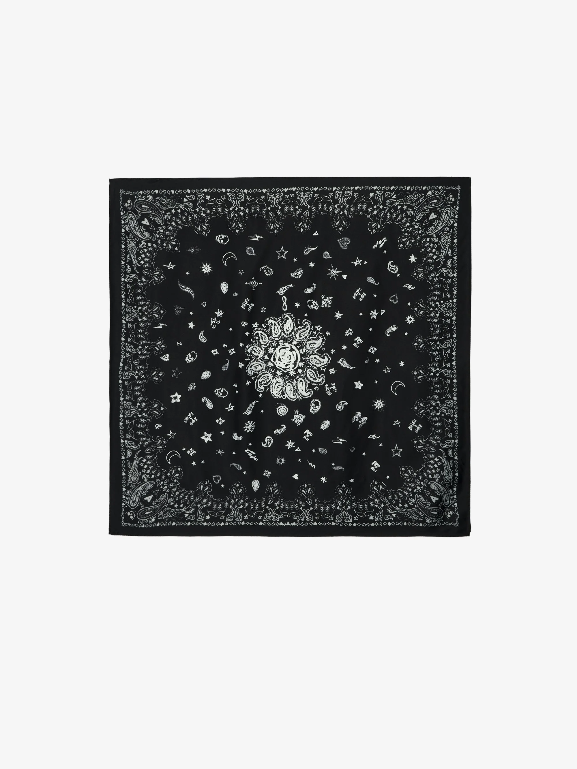 Square scarf in mixed silk with bandana print. Description & details - Square scarf in mixed silk - Bandana print - Made in Italy 85 cm Composition 65% Viscose** 35% Silk Care - Hand-wash or machine-wash inside out in a mesh laundry bag on a 20°C delicate cycle with a maximum spin speed of 400 rpm - Air dry flat - Iron inside out at a maximum of 110°C Product code: OWSC01504_BLACK