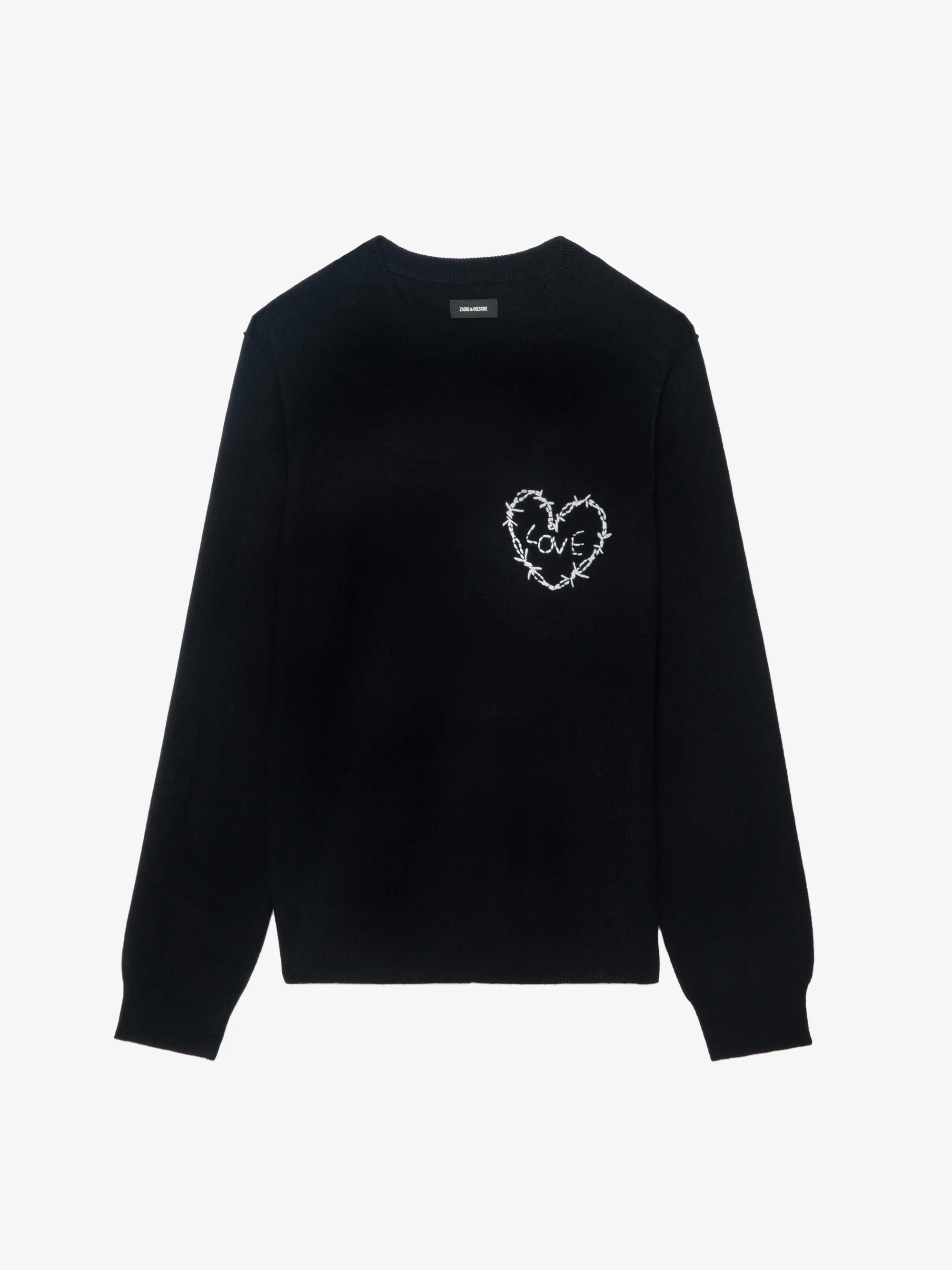 Sweater with round neck and heart embroidery on the front. Description & details - Wool and cashmere sweater - Heart embroidery on the front - Round neck - Long sleeves Model is 189 cm / 6' 2" and is wearing a size M This item fits true to size. Choose your usual size. Composition 90% Wool* 10% Cashmere Care - Hand-wash or machine-wash on a 20°C wool cycle with a maximum spin speed of 400 rpm - Do not wring - Air dry flat - Iron inside out at a maximum of 110°C, avoiding any customised details Product code: KMSW01793_NOIR