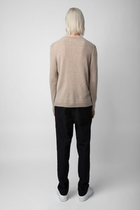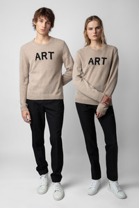 Unisex beige knit sweater with intarsia jacquard “Art” slogan. Description & details - Unisex Ficelle beige knit sweater - Intarsia jacquard “Art” slogan on the front and pointelle ZV signature - Round neckline, long sleeves and ribbed trim - Made in Italy Model is 188 cm / 6' 2" and is wearing a size M This item is true to size. We recommend buying your usual size. Composition 50% CASHMERE* 45% CASHMERE 5% WOOL Care Hand or machine wash your knitwear at 68°F in a pillowcase or washing bag. Do not use fabric softener or leave your knit soaking in water. The spin speed must not exceed 400 rpm. Dry flat on a towel away from direct sunlight and heat. Product code: KMSW00658_FICELLE