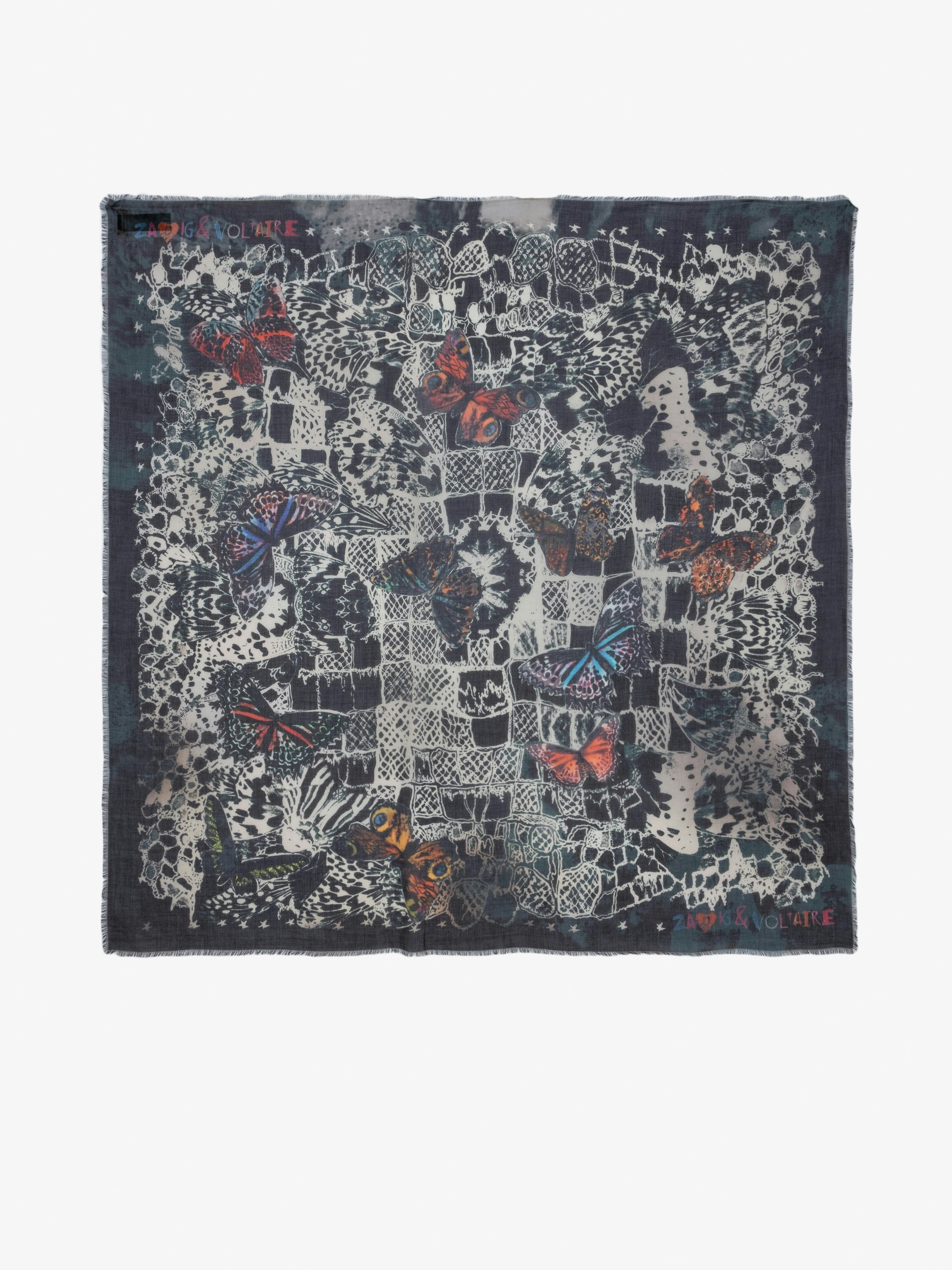 Navy blue scarf with butterfly print. Description & details - Women’s Ink navy blue square scarf - Butterfly print and lace - Fringed edges - Made in Italy 135 x 135 cm Composition 100% MODAL Care - Hand-wash or machine-wash inside out in a mesh laundry bag on a 20°C delicate cycle with a maximum spin speed of 400 rpm - Air dry flat - Iron inside out at a maximum of 110°C Product code: OWSC00491_INK
