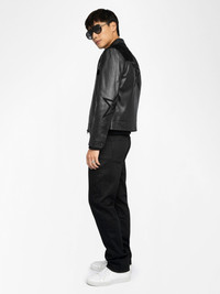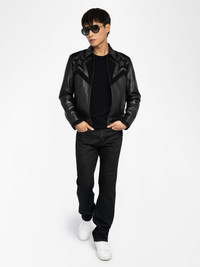 Smooth leather jacket with suede star patch, long sleeves and zip fastening. Description & details - Smooth leather jacket - Suede star patch - Classic collar - Zip fastening - Zip pockets - Long sleeves Model is 187 cm / 6' 1" and is wearing a size M This item has a fitted cut. If you are between sizes or prefer a looser fit, go for one size up. Composition 100% Lambskin Care This garment should be cared for by a leather professional. Product code: RMOW01120_BLACK