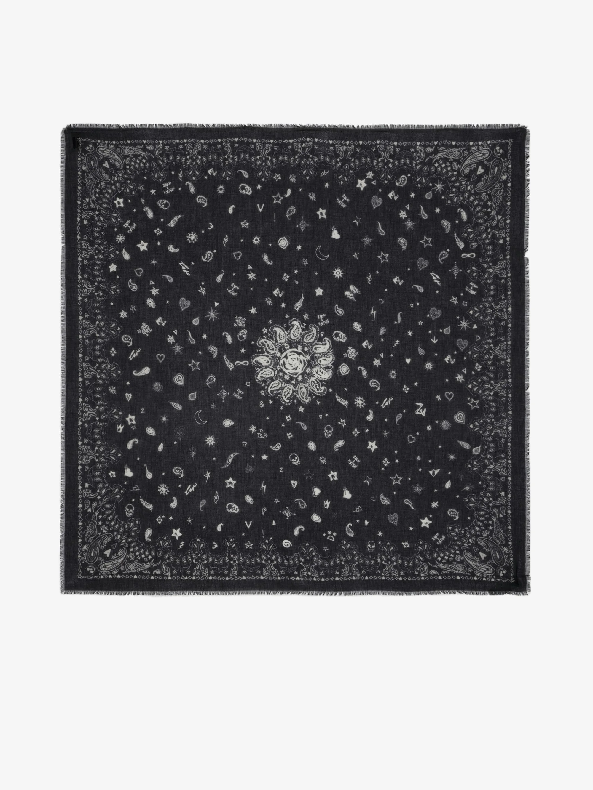 Black cotton scarf with bandana print. Description & details - Women's black cotton square scarf - Bandana print - Frayed edges - Made in Italy 120 x 120 x 120 cm Composition 100% Cotton** Care - Machine-wash inside out on a 30°C delicate cycle with similar colours - Air dry - Iron inside out at a maximum of 110°C, avoiding any customised details Product code: OWSC01499_BLACK