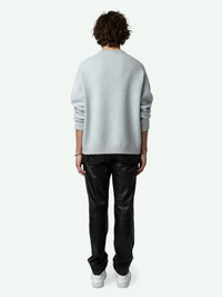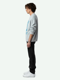 Long-sleeved loose-fitting light grey wool sweater with jacquard insignia on the front and contrasting edging. Description & details - Men’s Light Grey loose-fitting wool sweater - Jacquard knit Zadig&Voltaire University insignia on the front - Round neck - Long sleeves and ribbed edges with distressed effect - Contrasting trim on the left sleeve and ZV signature at the bottom Model is 183 cm / 6' 0" and is wearing a size M This item is true to size. We recommend buying your usual size. Composition 100% WOOL Care - Hand-wash or machine-wash on a 20°C wool cycle with a maximum spin speed of 400 rpm - Do not wring - Air dry flat - Iron inside out at a maximum of 110°C, avoiding any customised details Product code: KMSW00715_LIGHT GREY