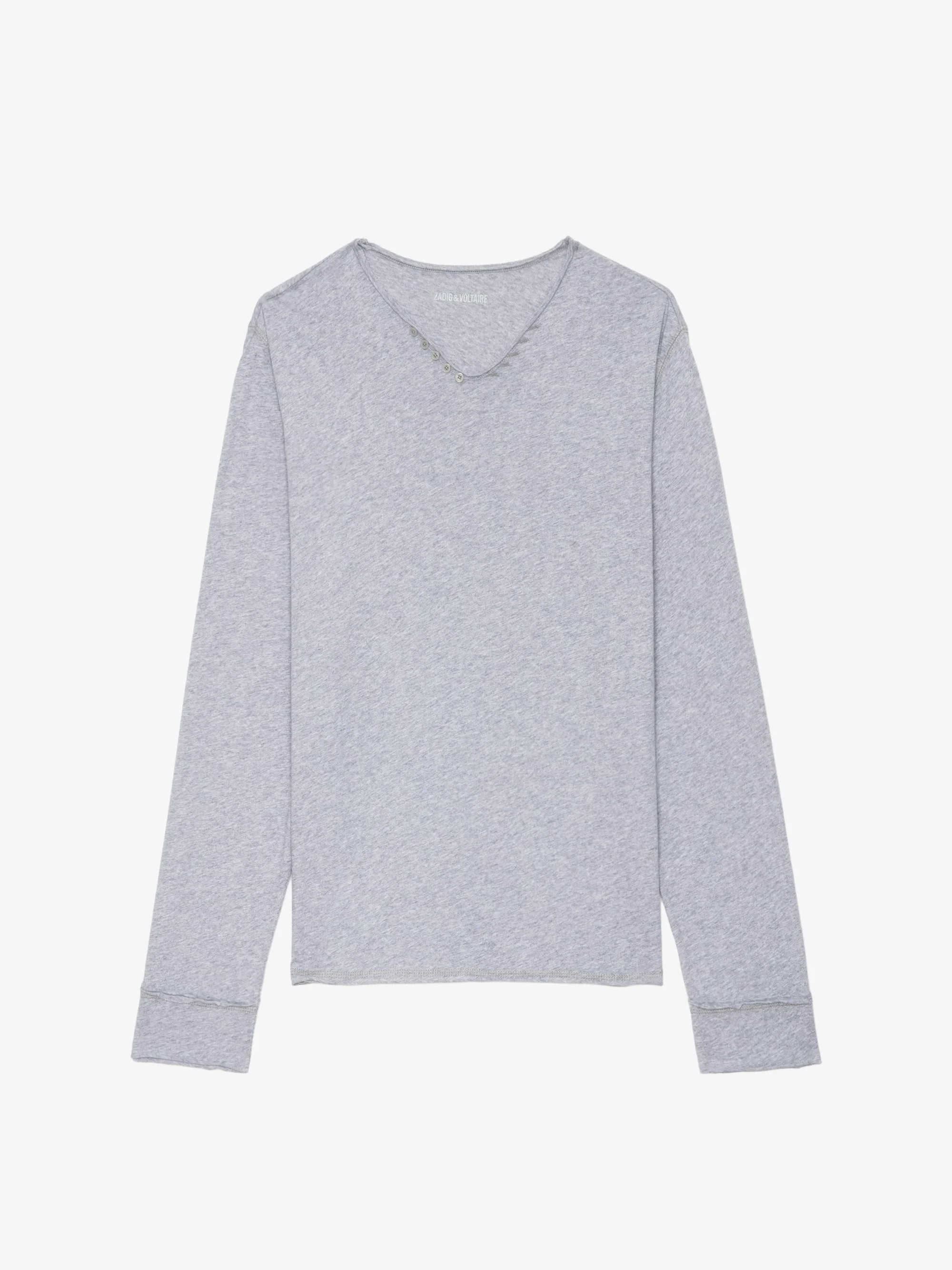 Grey marl long-sleeve henley t-shirt in organic cotton. Description & details - Henley t-shirt in organic heather grey cotton for men - 5-button henley t-shirt collar - Long sleeves with raw edges - Made in Portugal Model is 184 cm / 6' 0" and is wearing a size M This item is true to size. We recommend buying your usual size. Composition 100% Cotton* Care - Machine-wash inside out on a 30°C delicate cycle with similar colours - Air dry - Iron inside out at a maximum of 110°C, avoiding any customised details Product code: JMTN01630_GRIS CHINE