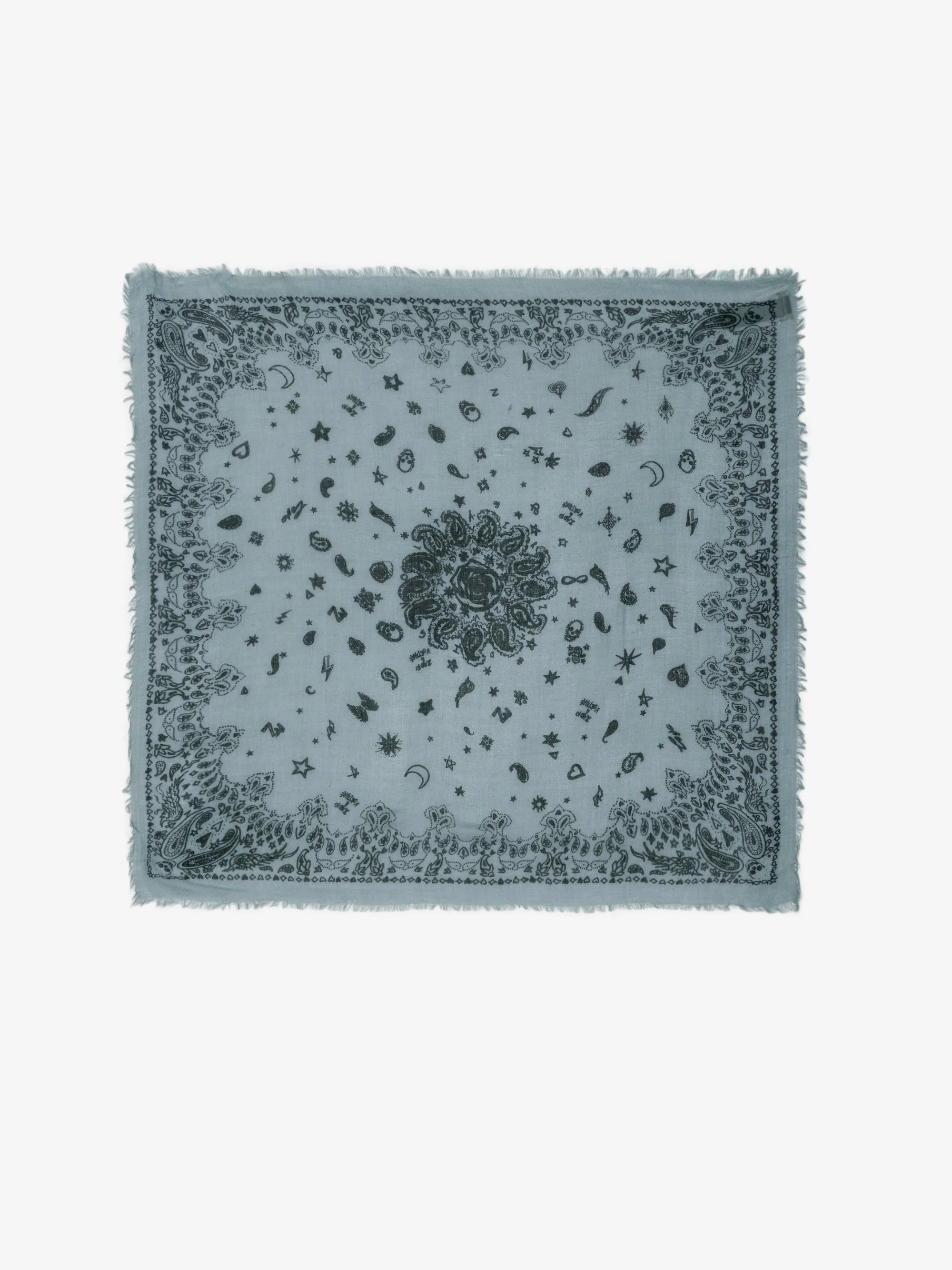 Feather cashmere scarf with bandana print. Description & details - 100% cashmere scarf - Bandana print - Naturally warm, feather cashmere is lighter and more delicate than classic cashmere. It comes from a finer knit, making it an exceptional piece. 90 x 90 cm Composition 100% Cashmere Care - Hand-wash or machine-wash on a 20°C wool cycle with a maximum spin speed of 400 rpm - Do not wring - Air dry flat - Iron inside out at a maximum of 110°C, avoiding any customised details Product code: OWSC01524_BABY BLUE
