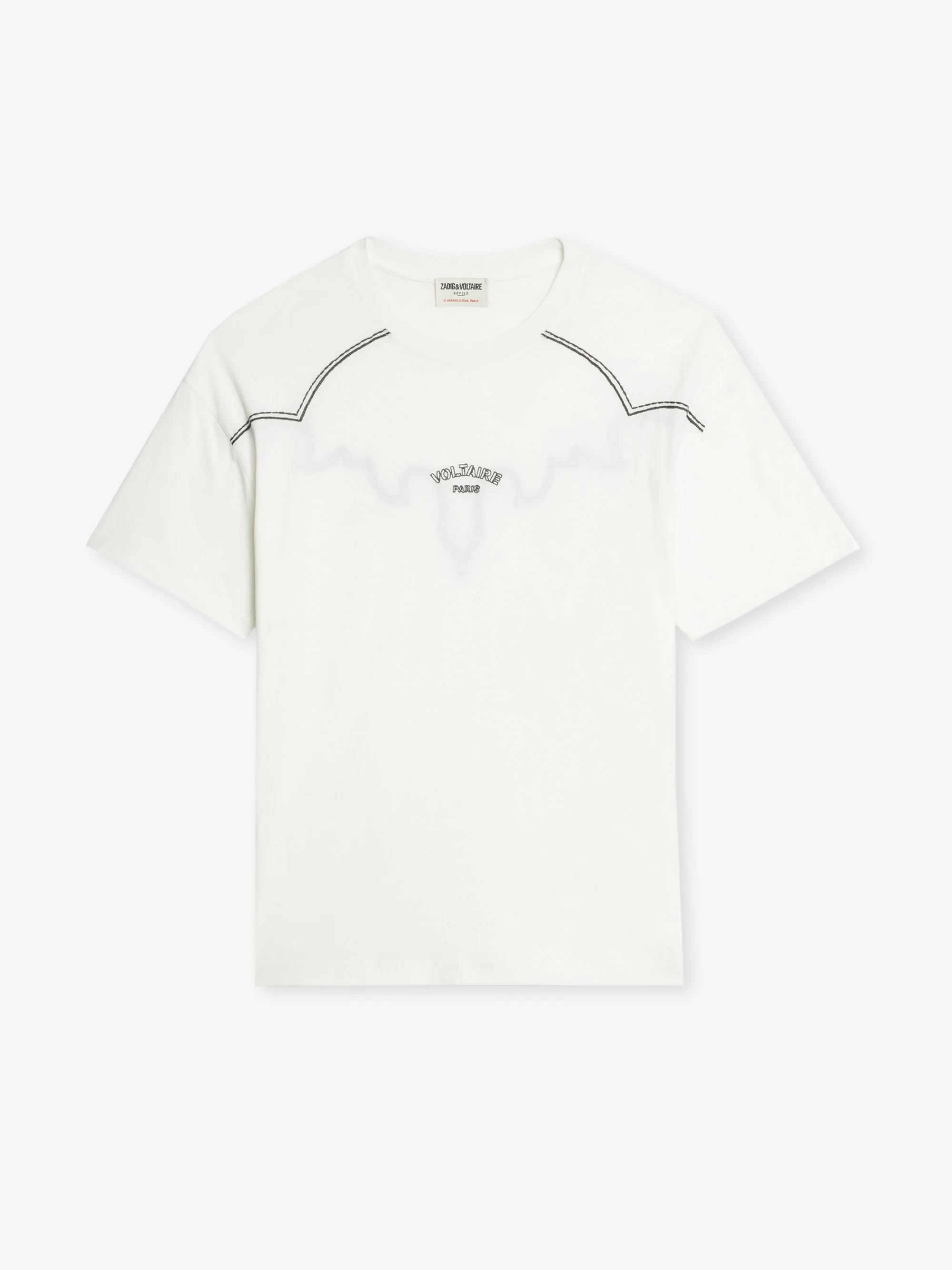 Loose-fitting short-sleeve T-shirt with western cut-outs. Description & details - T-shirt in 100% cotton - Western embroidery - Round neck - Short sleeves - Loose fit This item has a loose fit. For a more fitted look, choose one size down from your usual size. Composition 100% Cotton* Care - Machine-wash inside out on a 30°C delicate cycle with similar colours - Air dry - Iron inside out at a maximum of 110°C, avoiding any customised details Product code: JMTS01737_ECRU
