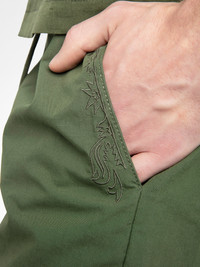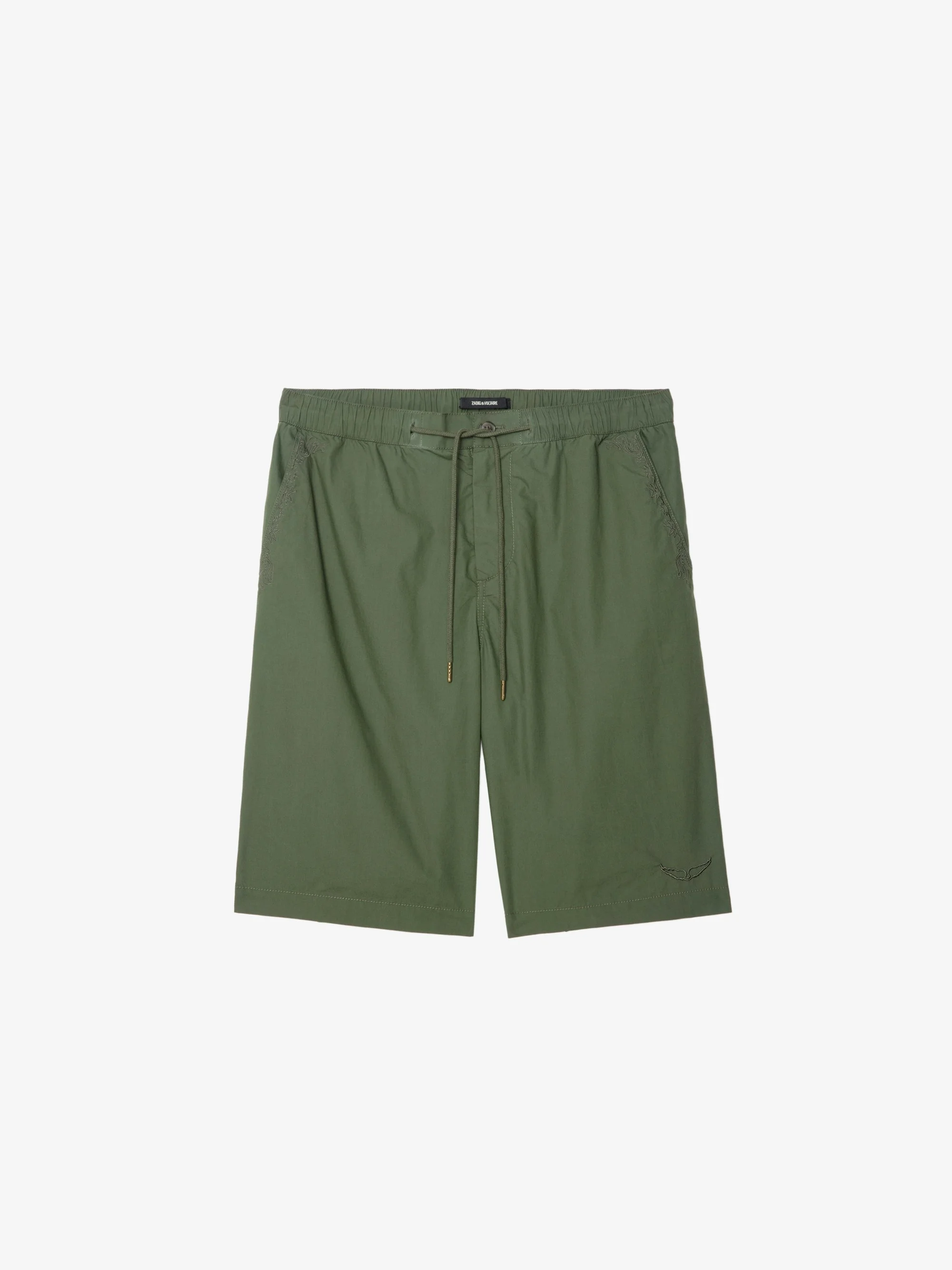 Knee-length wide Bermuda shorts with elasticated waistband and drawstring, central button fastening and zip closure, accompanied by a western-inspired embroidery. Description & details - Knee-length wide Bermuda shorts - Western-inspired embroidery - Elasticated waistband with drawstring, central button fastening and zip closure - 2 patch pockets Model is 187 cm / 6' 1" and is wearing a size M This item fits true to size. Choose your usual size. Composition 100% Cotton** Care - Machine-wash inside out on a 30°C delicate cycle with similar colours - Air dry - Iron inside out at a maximum of 110°C, avoiding any customised details Product code: WMBS01065_USED KAKI