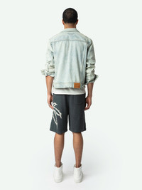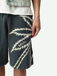Knit shorts with palm tree design on the thigh. Description & details - Knit shorts - Jacquard intarsia palm tree pattern on the thigh - Drawstring waist - 2 side pockets and 1 back pocket Model is 186 cm / 6' 1" and is wearing a size M This item is true to size. We recommend buying your usual size. Composition 60% Cotton* 25% Viscose 15% Linen Care - Hand-wash or machine-wash on a 20°C wool cycle with a maximum spin speed of 400 rpm - Do not wring - Air dry flat - Iron inside out at a maximum of 110°C, avoiding any customised details Product code: KMPA01006_VERT DE GRIS