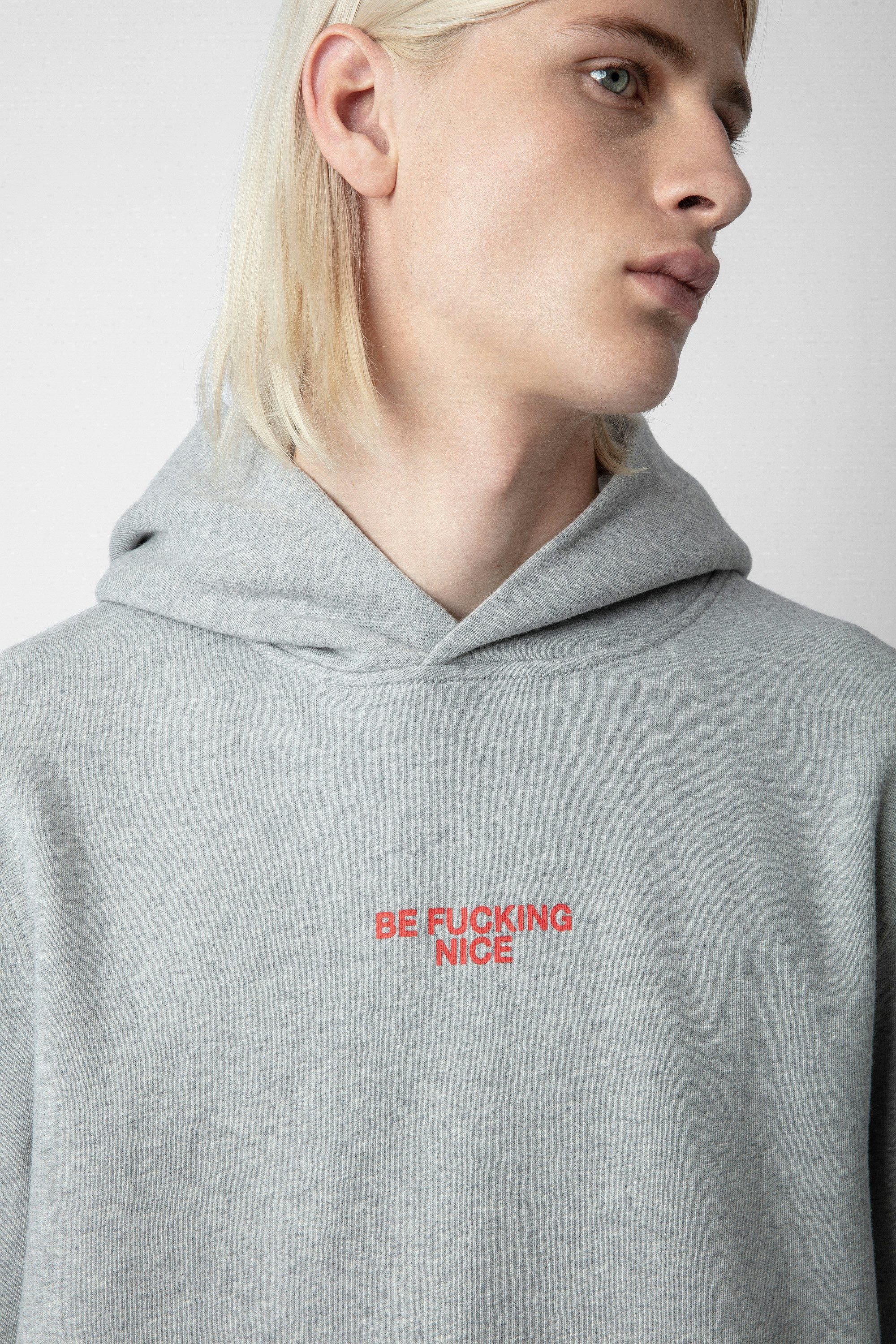 Men’s grey marl hoodie with “Be Fucking Nice” slogan. Description & details - Men’s grey marl cotton hoodie - “Be Fucking Nice” slogan on the front - Long sleeves - Front pocket Model is 189 cm / 6' 2" and is wearing a size M This item is true to size. We recommend buying your usual size. Composition 100% COTTON* Care Hand-wash or machine-wash your garment at a maximum of 20 °C, in a mesh laundry bag and inside out, with a gentle spin cycle. Air-dry. Iron your garment on a low heat setting or steam from a distance of 20 cm, being particularly careful with customised details. Product code: JMSS00227_GRIS CHINE