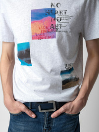 Light grey marl cotton round-neck T-shirt with Multiposter photoprint. Description & details - Men’s light grey marl cotton T-shirt - Multiposter photoprint on the front and back - Round neckline and short sleeves - Made in Portugal Model is 187 cm / 6' 1" and is wearing a size M This item is true to size. We recommend buying your usual size. Composition 100% COTTON Care - Machine-wash inside out on a 30°C delicate cycle with similar colours - Air dry - Iron inside out at a maximum of 110°C, avoiding any customised details Product code: JMTS00639_GRIS CHINE CLAIR