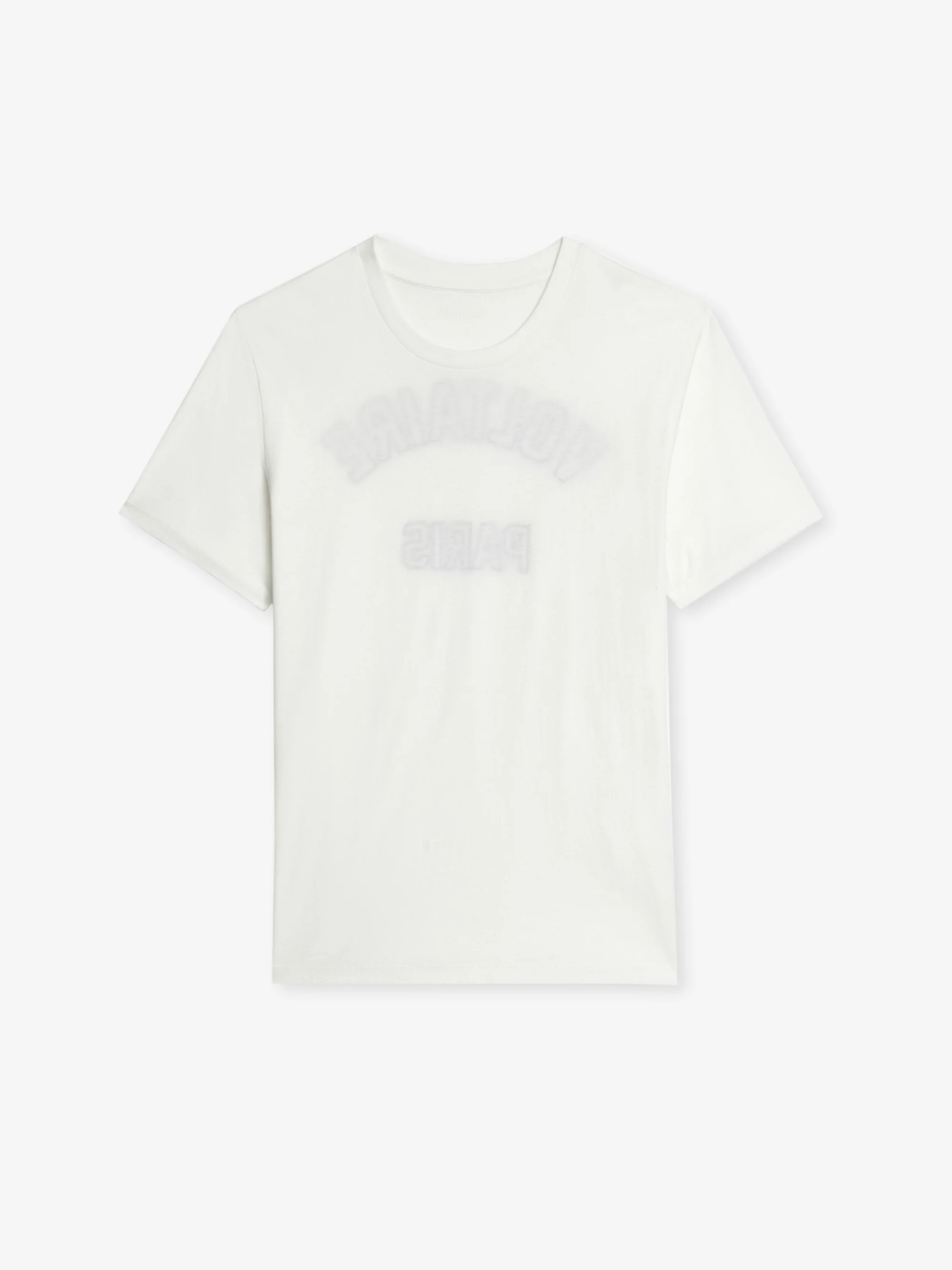Short-sleeved T-shirt with back print. Description & details - T-shirt in 100% cotton - "Voltaire Paris" inscription on the back - Round neck - Short sleeves Model is 188 cm / 6' 2" and is wearing a size M This item fits true to size. Choose your usual size. Composition 100% Cotton* Care - Machine-wash inside out on a 30°C delicate cycle with similar colours - Air dry - Iron inside out at a maximum of 110°C, avoiding any customised details Product code: JMTS01734_JUDO