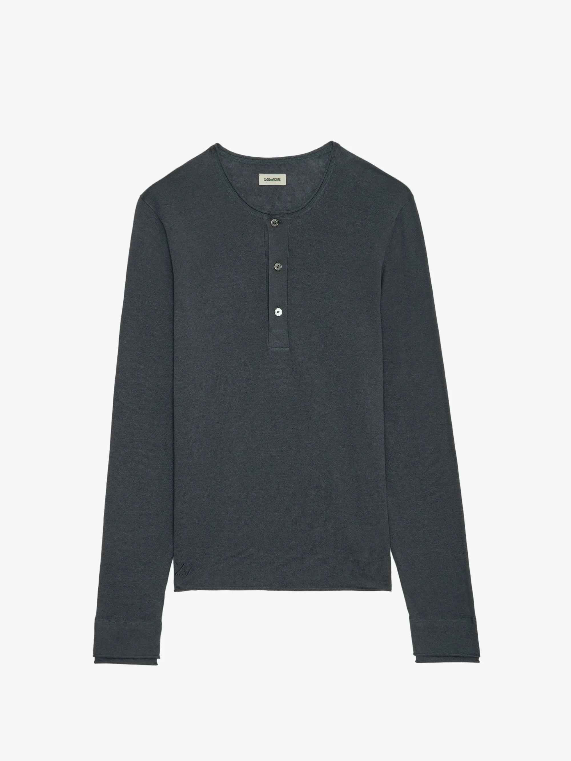Fine knit sweater with buttoned collar. Description & details - Fine knit sweater - Buttoned round neck - Long sleeves, ZV signature and raw edges Model is 186 cm / 6' 1" and is wearing a size M This item is true to size. We recommend buying your usual size. Composition 50% Linen 36% Cotton** 14% Polyamide Care - Machine-wash inside out on a 30°C delicate cycle - Do not bleach and do not tumble dry - Air dry - Iron inside out at a maximum of 150°C, avoiding any customised details Product code: KMSW01719_VERT DE GRIS