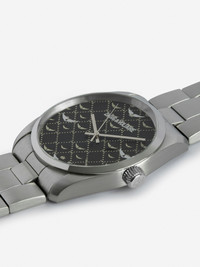 Gray stainless steel watch with black monogram pattern dial. Description & details - Unisex gray stainless steel watch - Black dial with monogram pattern - Diameter 36 mm - Quartz movement - Functions: hour/minute - Water-resistant to 5 bar - Steel bracelet - Round case Composition 100% Steel Care - Clean you jewellery with a soft, dry cloth - Avoid contact with water and chemicals (fragrance, cosmetics, chlorine, hydroalcoholic gel) - Protect your jewellery from humidity and any source of heat - Avoid sleeping with your jewellery on - Store your jewellery in its protective pouch " Product code: OWWT00120_BLACK