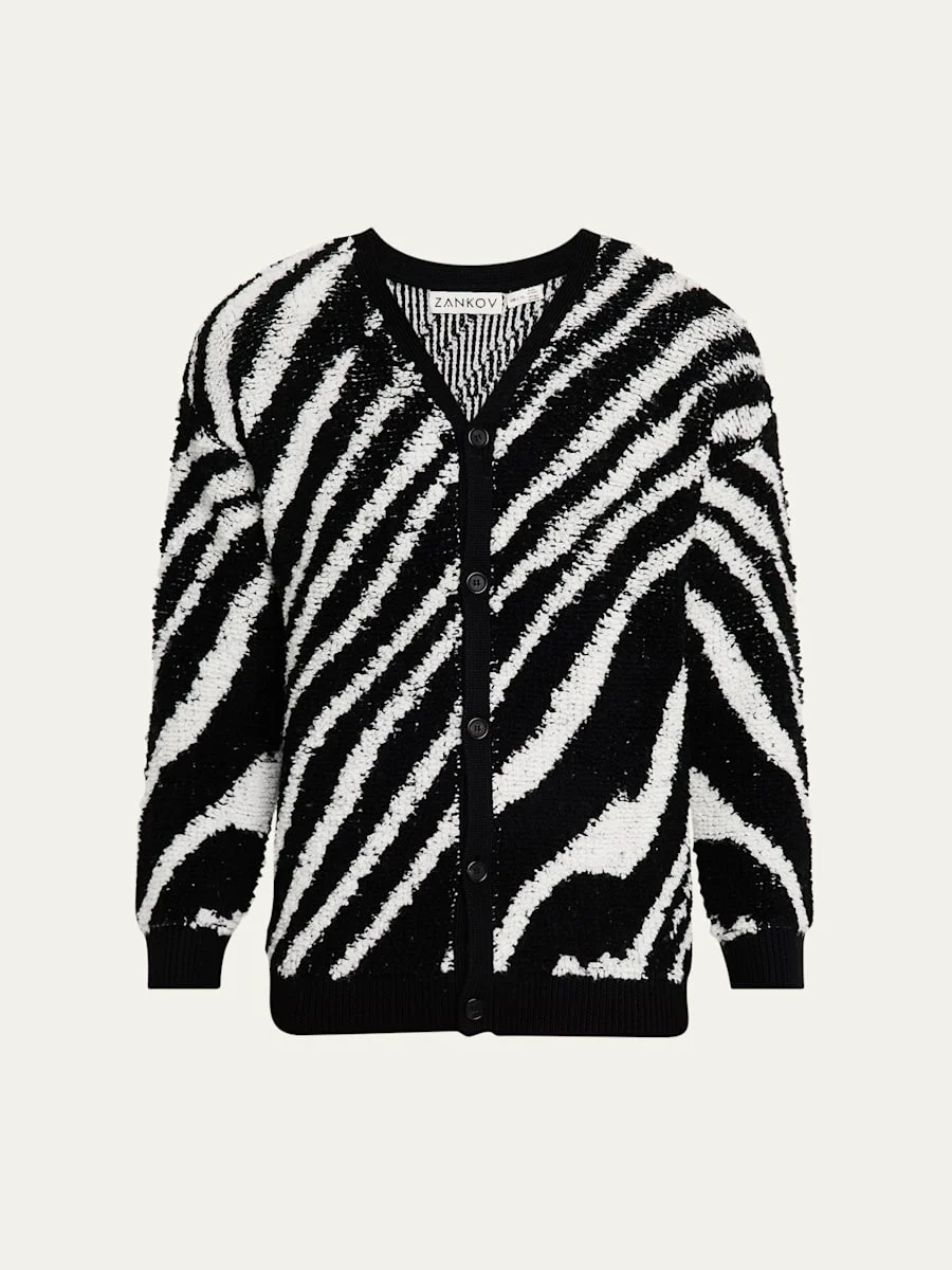 ZANKOV cardigan sweater with intarsia zebra stripes V-Neck Button closure Long sleeves Ribbed cuffs and hem Relaxed fit Merino wool Imported Online Inquiries: BGS21_NCJXW| Store Inquiries: #4896328