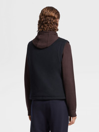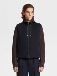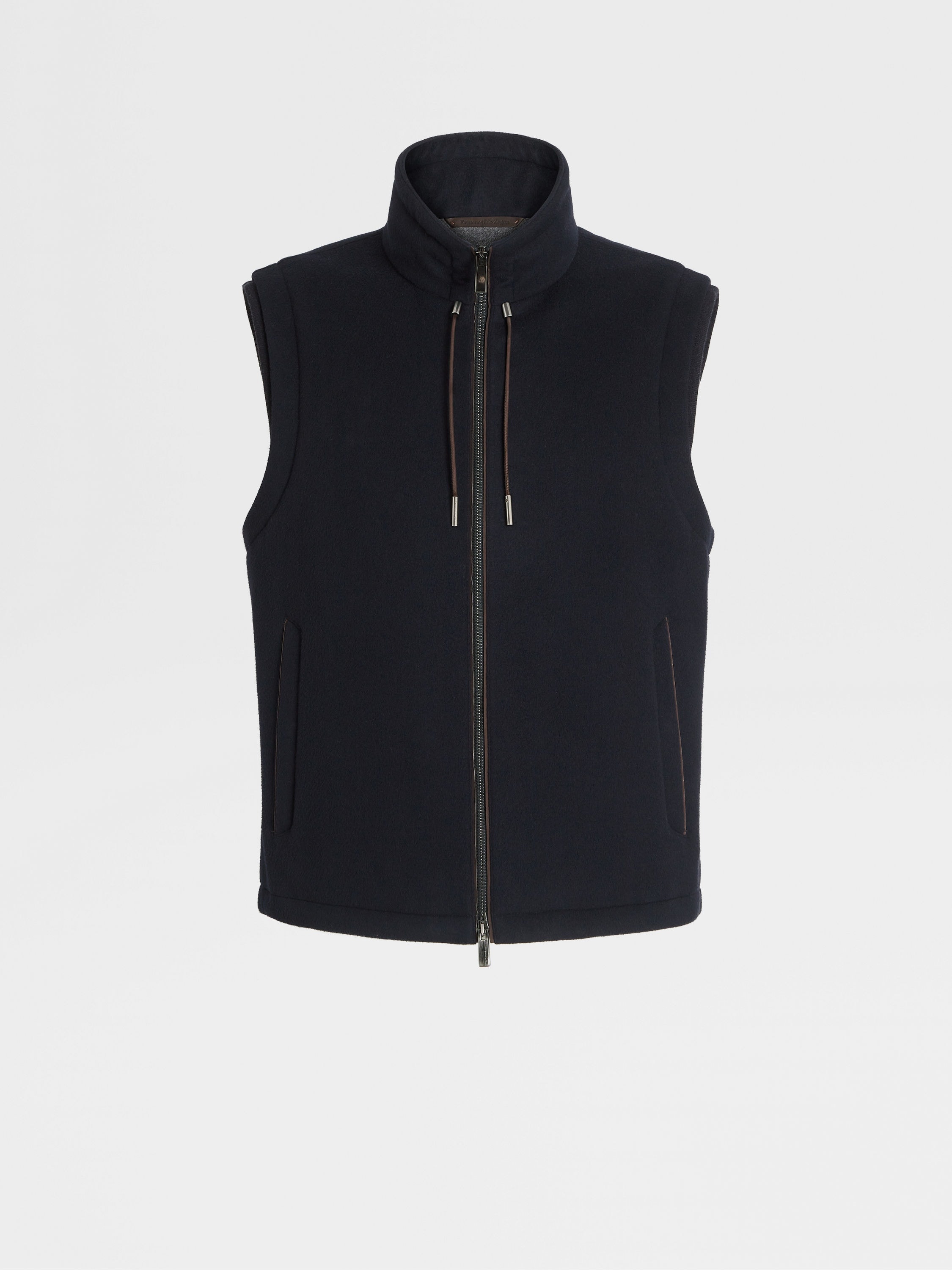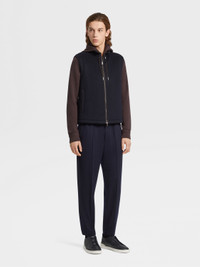 The navy blue 12milmil12 down filled vest is a luxurious take on a sporty staple. INFO Crafted from Zegna's exclusive, 12-micron wool, the navy blue 12milmil12 down filled vest is exceptionally smooth and lightweight. Its water-repellent finish grants it even more versatility. A leather drawstring accentuates the sleek, navy blue design. PRODUCT CODE E7T02-TMIL13-531 MATERIALS AND CARE Main body: 100% Wool Details: Calfskin Lining: 89% Wool; 6% Silk; 5% Cashmere Padding: 85% Goose Down; 15% Polyester Driven by a pioneering vision, Zegna was the first to incentivize the breeding of superfine Australian wools. At only 12 micron, the rareness of this fiber is due to the limited quantity produced worldwide every year. Mild dry clean with hydrocarbon solvents. Do not bleach. Do not tumble dry. Regular ironing, steam or dry, may be performed at low setting (110°C / 230°F). FIT AND PRODUCT DETAILS • Regular fit • Standing collar • Zip closure • Drawstring bottom • Leather drawstring • Goose down blend padding • Water-repellent • 64cm length on size 48