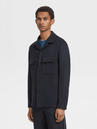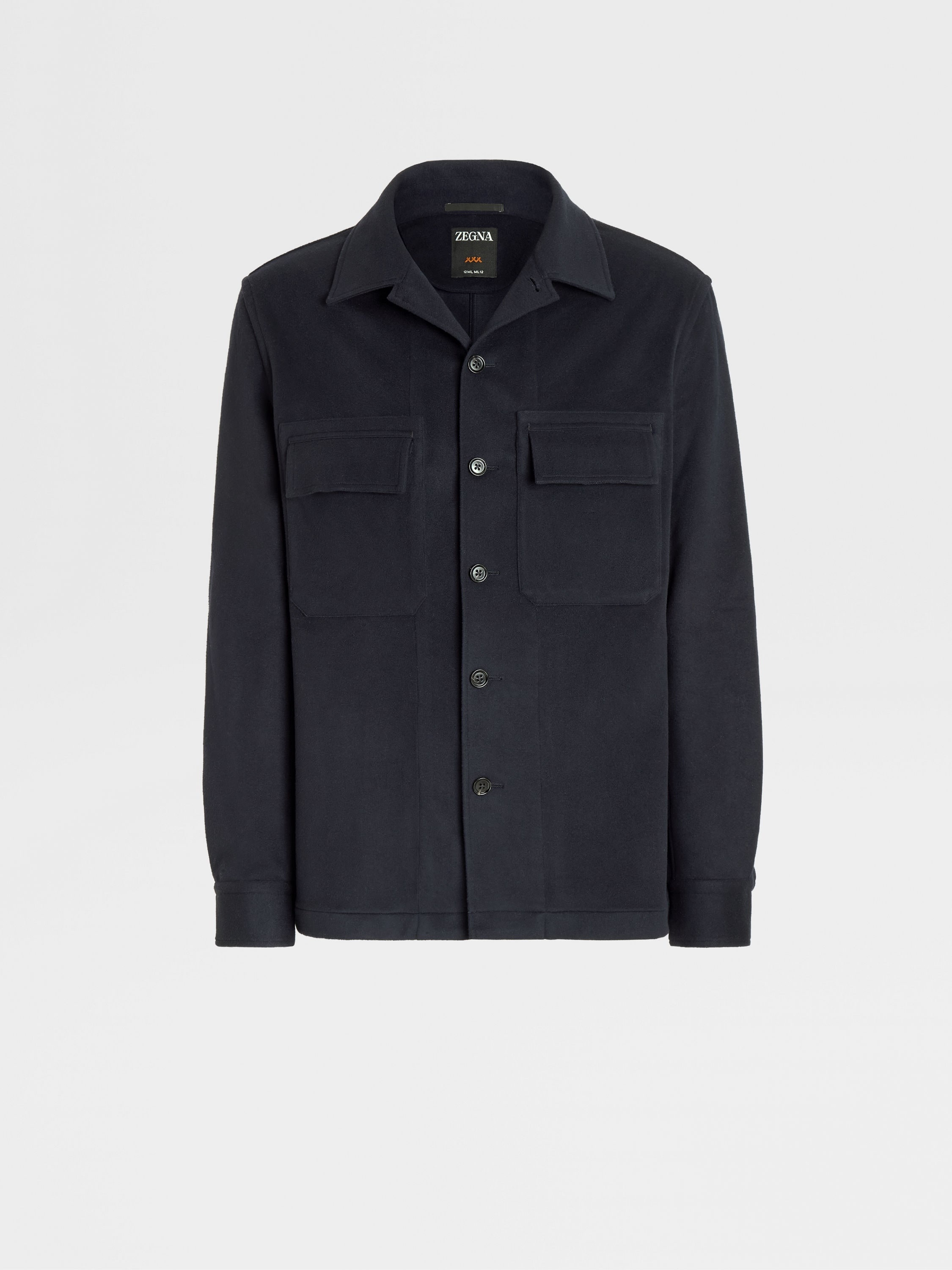 The navy blue 12milmil12 wool overshirt showcases Zegna's 12-micron yarn. INFO Produced in limited quantities each year, the navy blue 12milmil12 wool overshirt's superfine Merino fibers are paired with a silk lining. The luxurious overshirt is styled with elbow patches and flap pockets for an extra boost of edge. The classic collar and smooth cuffs tie it all together. PRODUCT CODE E7V36-SOT12-BLU MATERIALS AND CARE Main body: 100% Wool Leather details: Calfskin Lining: 100% Silk The wool of this 12milmil12 garment is obtained from Australian flocks that are specially bred for their superfine fleeces. Measuring just 12 microns in diameter, the exceptionally rare fibres are finer than both vicuña and cashmere. Mild dry clean. Do not bleach. Do not tumble dry. Regular ironing, steam or dry, may be performed at low setting (110°C / 230°F). FIT AND PRODUCT DETAILS • Regular fit • Shirt collar • Smoothed shirt cuffs • Button closure • Elbow patches • Flap pockets • Silk lining • 73 cm length on size 48