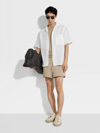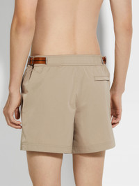 Choose a more elegant take on swimwear with the beige swim shorts' tailored construction. INFO Designed with a structured fit, the beige swim trunks feature adjustable side fasteners. The Zegna 232 Road Brand Mark along the sides adds a graphic accent to the sleek design. PRODUCT CODE N7B54-283-272 MATERIALS AND CARE 100% Polyamide Hand wash. Do not bleach. Do not tumble dry. Do not iron. Do not dry clean. Do not leave to soak in water. Do not rub. FIT AND PRODUCT DETAILS • Mid-length • Tailoring-inspired construction • Adjustable side fasteners with Zegna 232 Road Brand Mark tape • Premium quick drying bio care fabric • Fits true to size