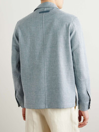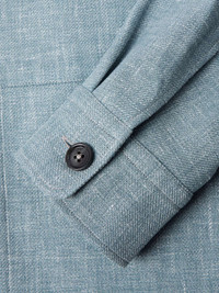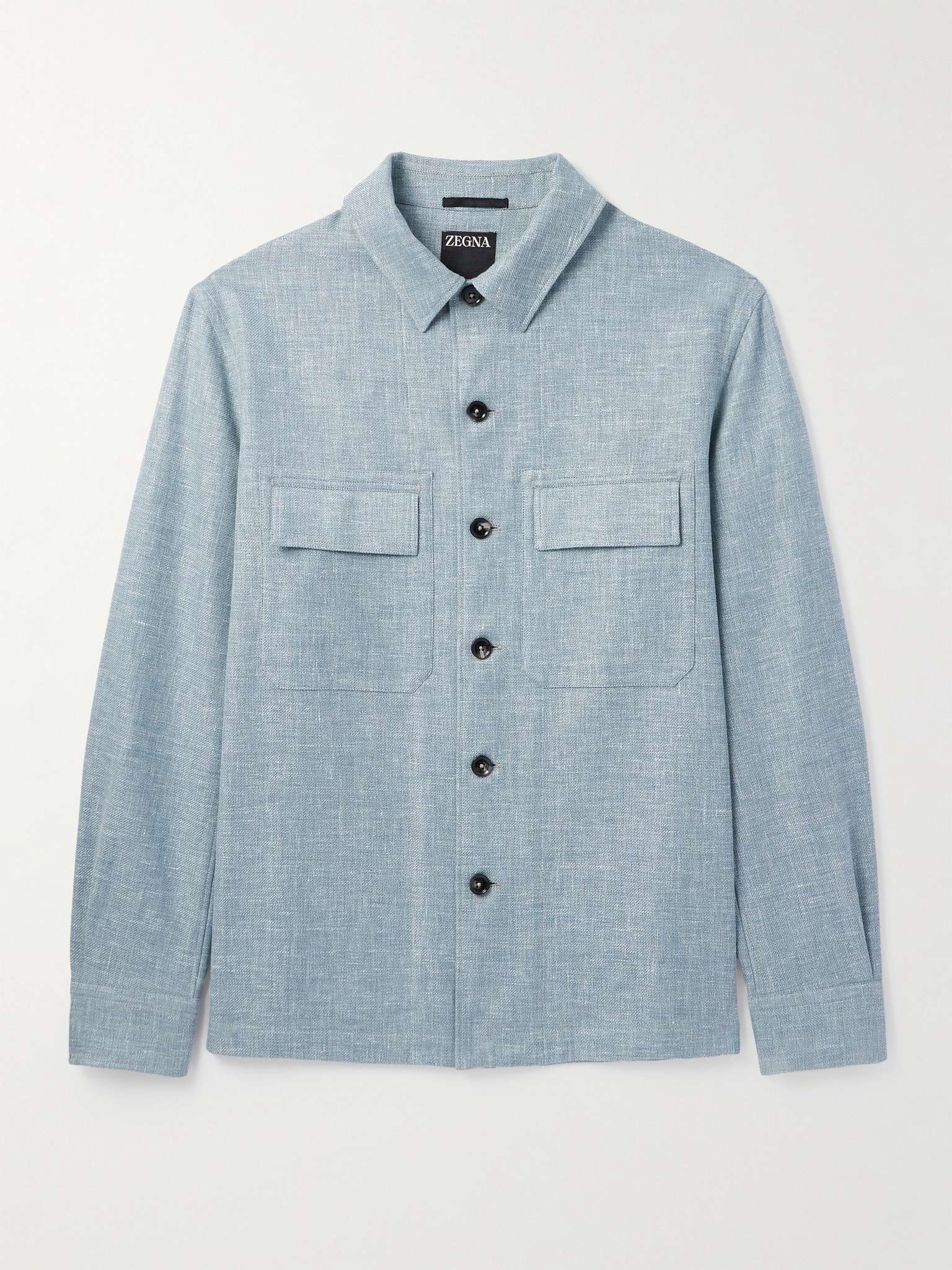 ZEGNA's strength lies in fabric selection. Riffing on chore jackets, this overshirt is woven with touches of linen, wool and silk and features the signature '232 Road Brand Mark' in leather at the nape. The slightly loose fit allows easy layering. Size & Fit - Fits true to size. Take your normal size - Designed for a slightly loose fit - Sized for layering - Mid-weight, slightly stretchy fabric - Model is shown wearing a M - Model measures: chest 38"/ 96cm, height 6'2"/ 188cm Details & Care - Light-blue melange linen, wool, silk, polyamide and elastane-blend and leather - Button fastenings - 46% linen, 31% wool, 19% silk, 3% polyamide, 1% elastane; trim: 100% leather (Calf) - Dry clean