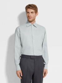 This aqua green long-sleeve shirt is crafted from a luxurious blend of silk, cotton and cashmere. INFO A sublime silk-cotton-cashmere blend elevates a familiar silhouette to luxury status with this long-sleeve shirt. Presented in a refined aqua green shade, this versatile yet sophisticated garment features a semi-spread collar and rounded hem. PRODUCT CODE 202215A2-9NS0AT MATERIALS AND CARE 47% Mulberry Silk; 45% Cotton; 8% Cashmere Wash by hand. Do not bleach. Do not tumble dry. Flat drying. Iron at max 110°C. Professional dry cleaning in tetrachloroethene and hydrocarbons. FIT AND PRODUCT DETAILS • Regular fit • Tailoring shirt • Semi-spread collar • Standard cuffs • Button closure • Rounded hem • Lightweight fusing • 79 cm length on size 39
