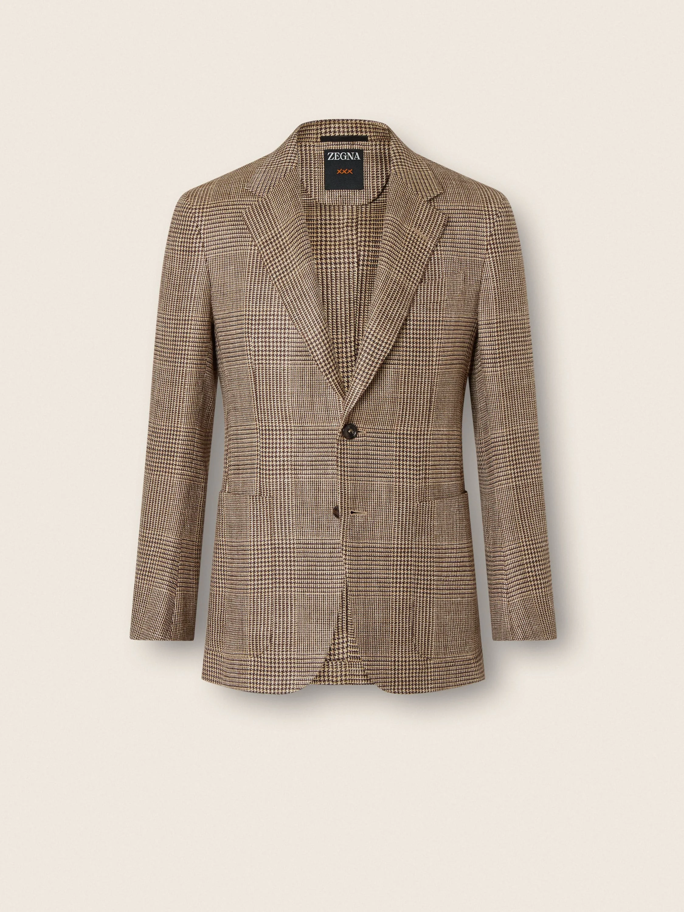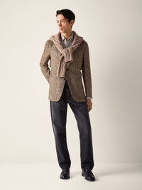 This beige and dark brown cardigan jacket is crafted from a luxurious silk-linen-wool blend. INFO Continuing ZEGNA's legacy of fine menswear, this silk, linen and wool cardigan jacket exudes timeless elegance with its beige and Corteccia Oasi Prince of Wales pattern. Double vents, notch lapels and patch pockets enrich its deconstructed silhouette with sartorial finesse. Corteccia Oasi (ˈkorˈtɛtt͡ʃa) – ITALIAN FOR 'BARK', this is the colour of tree bark and of the earth in Oasi Zegna, reimagined by our Founder. The tone is identified as dark, earthy brown. PRODUCT CODE 349069A3-10JCN0 MATERIALS AND CARE 37% Tussah Silk; 37% Linen; 26% Wool Do not wash. Do not bleach. Do not tumble dry. Iron at max 110°C. Professional dry cleaning in tetrachloroethene and hydrocarbons, mild process. FIT AND PRODUCT DETAILS • Regular fit • Tailoring jacket • Double vents • Notch lapels • Prince of Wales pattern • Button closure • Patch pockets • Deconstructed, canvas • Unlined • 75 cm length on size 48 Sleeves hems are unfinished. You can bring your jacket to our boutique for alterations.
