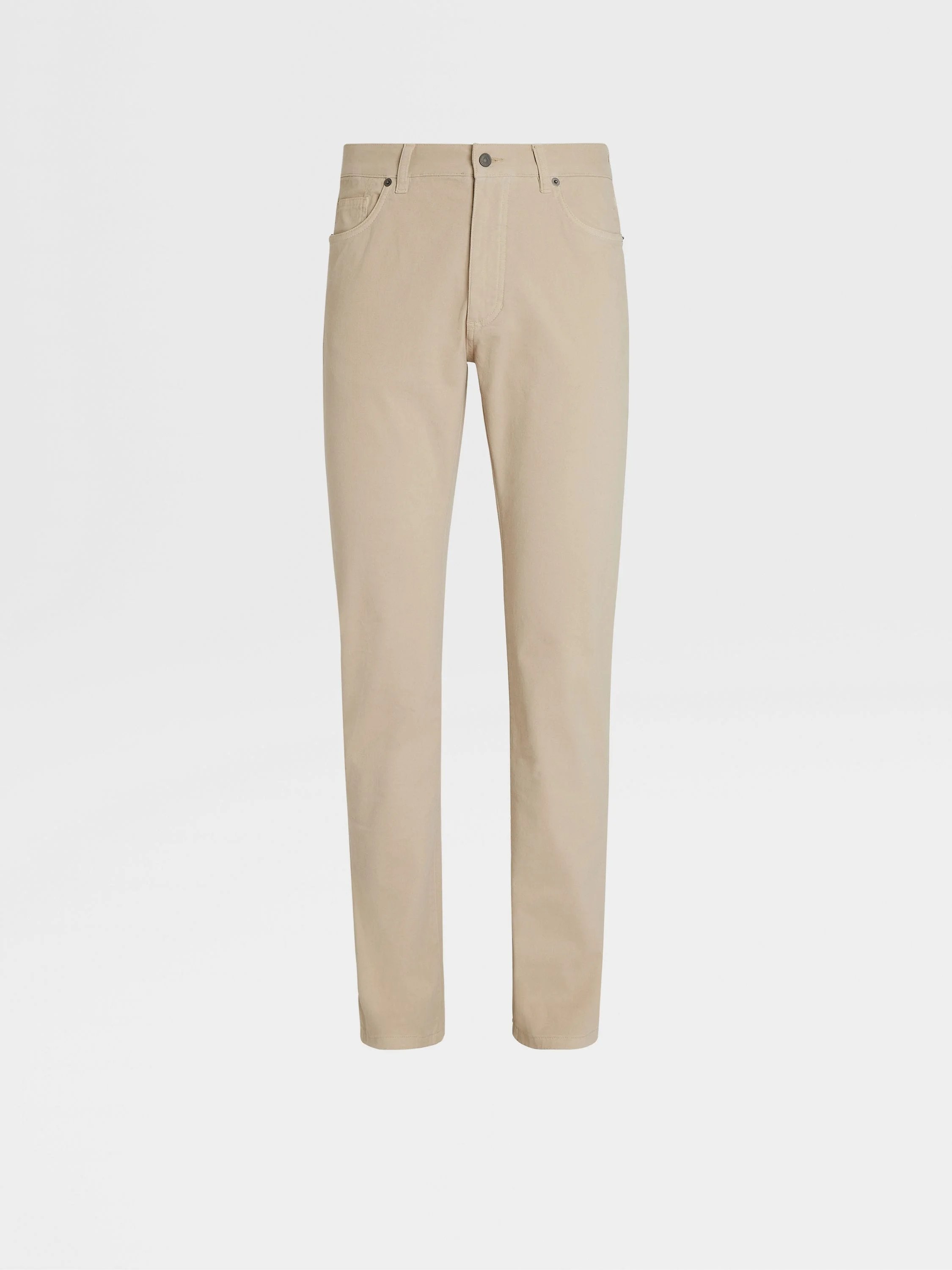The beige Roccia jeans are presented in smooth, stretch cotton gabardine. INFO Stretch cotton gabardine gives the beige Roccia jeans an extra smooth finish. The straight fit transitions easily from weekends to casual meetings, ideal for fast-paced contemporary lifestyles. The inspiration for the Roccia Jeans, Roccia the Italian word for 'Rock', was Born in Oasi Zegna — the home of our values in the Italian Alps. Inspired by classic workwear, they're both hardwearing and elegant, making them a reliable foundation to any look. PRODUCT CODE E8PZW-GAN-830 MATERIALS AND CARE 98% Cotton; 2% Elastane Machine wash, cold (30°C / 85°F), gentle or delicate. Do not bleach. Do not dry clean. Do not tumble dry. Dry in shade. Regular ironing, steam or dry, may be performed at low setting (110°C / 230°F). FIT AND PRODUCT DETAILS • Straight fit • 19 cm hem • Button closure • 5-pocket style • Garment dyed • Model is 187 cm tall (6.1 feet) and wears an Italian size 48.