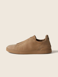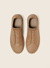 These beige Triple Stitch™ SECONDSKIN nubuck sneakers mold perfectly to your every stride. INFO These Triple Stitch™ SECONDSKIN sneakers are crafted from ZEGNA’s exclusive nubuck for a glove-like fit. Presented in beige with a tonal rubber sole, they feature our hallmark style's characteristic crossed elastics that evoke the traditional hand-stitching of tailored jackets in homage to the Brand's legacy of fine craftsmanship. The ZEGNA 232 Road Brand Mark on the heel tab signs off the design. The Triple Stitch™ SECONDSKIN shoes are the result of more than a century of generational craftsmanship, the sharing of wisdom, and dedication to innovation. Crafted from our SECONDSKIN leather, this shoe is for those who appreciate exceptional and contemporary style. The Triple Stitch™ SECONDSKIN nubuck has a soft, supple feel with a velvet-like finish for textural difference. PRODUCT CODE LHNBC-S7964Z-CRE MATERIALS AND CARE Nubuck SECONDSKIN is crafted by tanneries selected for their renowned expertise. Fine, supple and incredibly soft to the touch, it offers impeccable comfort with each wear. Clean the shoes with a soft bristle brush. Avoid contact with water and substances containing alcohol (perfumes, solvents, etc.) and, in general, any abrasive products. In the event of contact with water, it is important to allow the shoes to dry completely before cleaning. Clean the rubber sole with a product specially designed for cleaning rubber. Store the shoes in a cool, dry place in the fabric bags provided at the time of purchase. To preserve the quality of your Triple Stitch™ SECONDSKIN, we recommend using our exclusive Care Kit. FIT AND PRODUCT DETAILS • Crossed elastics • SECONDSKIN nubuck • Tonal rubber sole • Strobel construction • ZEGNA 232 Road Brand Mark on the heel tab • Sanitized® removable footbed • Made in Italy • Comes with a shoe bag We want every pair of Triple Stitch™ sneakers to fit perfectly anytime, anywhere, anyplace. To find your perfect fit, we recommend going down a half-size compared to your usual shoe size. Please note that ZEGNA uses UK sizing. For further information, please contact us via our customer service channels or by visiting the nearest ZEGNA flagship store.