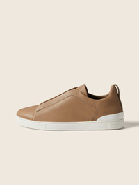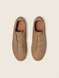 The beige Triple Stitch™ SECONDSKIN leather sneakers offer exceptional comfort and flexibility. INFO The beige Triple Stitch™ SECONDSKIN sneakers are crafted from specially selected leather for even more flexibility. The Brand’s signature triple-crossed elastic detail ensures an easy slip-on fit, while evoking the traditional hand-stitching of tailored jackets to symbolize and honor ZEGNA’s legacy of fine craftsmanship. The super soft, light uppers are complemented by a white rubber sole. The Triple Stitch™ SECONDSKIN shoes are the result of more than a century of generational craftsmanship, the sharing of wisdom, and dedication to innovation. Crafted from our SECONDSKIN leather, which ensures a glove-like fit, they are ideal for travelling in exceptional style and comfort. PRODUCT CODE LHOTA-S5207Z-CRE MATERIALS AND CARE Calfskin SECONDSKIN is crafted by tanneries selected for their renowned expertise. Fine, supple and incredibly soft to the touch, it offers impeccable comfort with each wear. Cherish your shoes with care to allow their story to unfold in elegance. Gently wipe your shoes with a soft cloth to preserve their refined finish. Lighter leathers, in particular, may be marked by repeated contact with darker fabrics, so handle with mindful attention. Avoid contact with water, oily substances, and alcohol-based products such as perfumes or solvents, as well as any abrasive materials that may damage the surface. Should they come into contact with moisture, allow them to dry fully before resuming any care routine. Protect your shoes from prolonged exposure to direct sunlight or artificial light to maintain their natural color and texture. Refresh the rubber sole using specific cleaning products designed for this material. Alternate their use to extend their life and ensure they retain their impeccable shape by filling them with shoe trees or soft tissue paper when not in use. Be sure to store your shoes in the fabric bags provided, in a cool, dry place. To preserve the quality of your Triple Stitch™ SECONDSKIN, we recommend using our exclusive Care Kit. FIT AND PRODUCT DETAILS • Crossed elastics • SECONDSKIN leather • White rubber sole • Strobel construction • ZEGNA 232 Road Brand Mark on the heel tab • Sanitized® removable footbed • Made in Italy • Comes with a shoe bag We want every pair of Triple Stitch™ sneakers to fit perfectly anytime, anywhere, anyplace. To find your perfect fit, we recommend going down a half-size compared to your usual shoe size. Please note that ZEGNA uses UK sizing. For further information, please contact us via our customer service channels or by visiting the nearest ZEGNA flagship store.