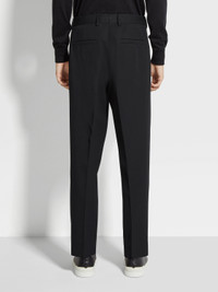 The black cotton and wool pants feature a single pleat down the front. INFO The black cotton and wool pants are a staple in any wardrobe. Easy to dress up or down, the pants pair lightweight fabric with a classic, pleated fit. They are styled with slanted pockets in the front and welt pockets on the back. Customize this item with our Made to Measure Service. For more information, please contact our Customer Care or visit your nearest stores. PRODUCT CODE UDI04A7-TP45-K09 MATERIALS AND CARE Main body: 57% Cotton; 43% Wool Lining: 100% Cotton Do not wash. Do not bleach. Do not tumble dry. Iron at max 110°C. Professional dry cleaning in hydrocarbons, mild process. Wash inside out. FIT AND PRODUCT DETAILS • Pleated fit • 19.5 cm open hem • One pleat front style • Zip and button closure • Slanted pockets • Back welt pockets • Model is 185 cm tall (6.0 feet) and wears an Italian size 48.