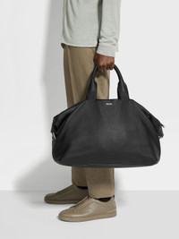 Make the black deerskin holdall Raglan your go-to weekend bag. INFO The black deerskin holdall Raglan's roomy design is perfect for travel. Its luxurious material stands up to active lifestyles while complementing the soft, versatile shape. The Zegna Logo adds a final accent. PRODUCT CODE LHCVM-C1891Z-NER MATERIALS AND CARE Main body: Deerskin Lining: 100% Cotton Protect from moisture and do not place near direct sources of heat. Clean with a soft cloth. Do not use solvents or polishes. Avoid contact with cosmetics, perfumes and hand lotions and sanitizers. Store in a cool, dry, well-ventilated place. Stow in the included dust bag when not in use. FIT AND PRODUCT DETAILS • Glazed silver finish • Grey mélange cotton lining • Zegna Logo • 44 x 30 x 17 cm / 17.3 x 11.8 x 6.6 in • Made in Italy