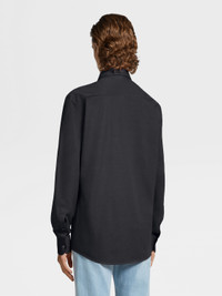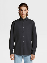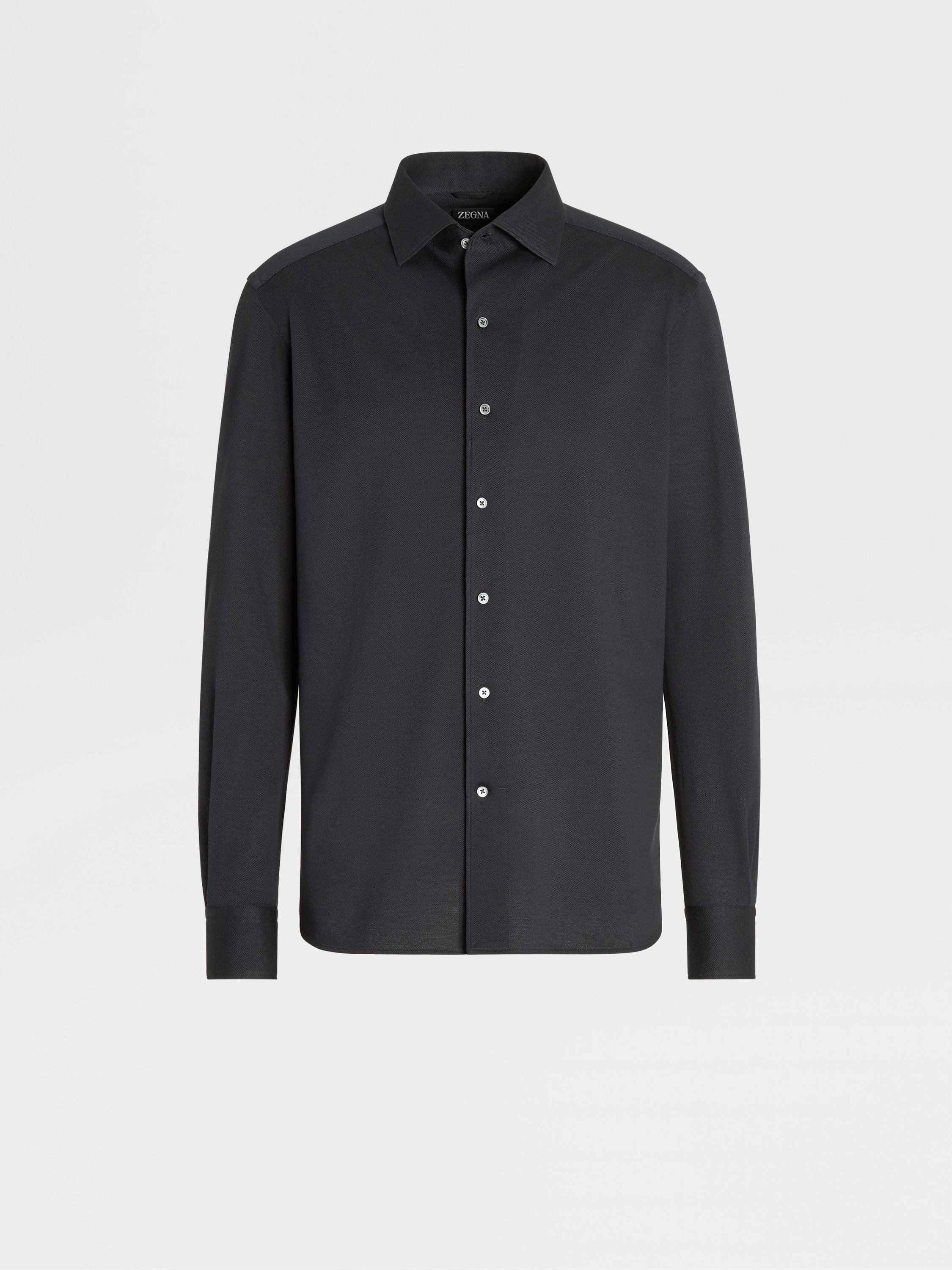 The black pure cotton jersey long-sleeve shirt is a comfortable choice for everyday wear. INFO Update your business wardrobe with the black pure cotton jersey long-sleeve shirt. Cotton jersey is perfect for busy days, thanks to its soft, breathable qualities. This sleek shirt is styled with a one-piece collar. PRODUCT CODE UBX18A5-SRO1-932 MATERIALS AND CARE 100% Cotton Hand wash (30°C / 85°F) or dry clean. Do not bleach. Do not tumble dry. Dry flat. Regular ironing, steam or dry, may be performed at low setting (110°C / 230°F). FIT AND PRODUCT DETAILS • Regular fit • Single piece collar • Standard cuffs • Button closure • 79 cm length on size 39
