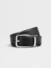 The black reversible leather belt features two elegant textures. INFO A versatile accessory, the back of the black reversible leather belt is in supple black calfskin. The buckle's palladium finish adds sophisticated shine. PRODUCT CODE LHROM-B007PZ-NER MATERIALS AND CARE Calfskin; Bovine Leather Protect from moisture and do not place near direct sources of heat. Clean with a soft cloth. Do not use solvents or polishes. Avoid contact with cosmetics, perfumes and hand lotions and sanitizers. Store in a cool, dry, well-ventilated place. Stow in the included dust bag when not in use. FIT AND PRODUCT DETAILS • Metal buckle with palladium finish • Width: 3.5 cm / 1.4 in • Fully adjustable • Reversible belt • Front in black calfskin, reverse in black leather • Zegna Logo • Made in Italy