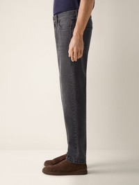 A black stone-washed finish gives these cotton Roccia jeans their authentic lived-in feel. INFO Cut to perfection with a slim leg and narrow cuff, these pure cotton Roccia jeans are the definition of elevated off-duty style. Finished with a light stone-washed finish in Nero Oasi. Nero Oasi (Nerō) – ITALIAN FOR 'BLACK', this is the color of magnetite, a stone charged with magnetic force that's found in Oasi Zegna. The tone is identified as matte black. ROCCIA ('rɔt:ʃa) — ITALIAN FOR 'ROCK' The inspiration for the Roccia Trousers was Born in Oasi Zegna, the home of our values in the Italian Alps. Inspired by classic workwear, they're both hardwearing and elegant, making them a reliable foundation to any look. PRODUCT CODE UHIK3A3-CITYE-001 MATERIALS AND CARE 100% Cotton Max washing temp 30°C, mild process. Do not bleach. Do not tumble dry. Line drying in the shade. Iron at max 110°C. Do not dry clean. Wash separately. Wash inside out. FIT AND PRODUCT DETAILS • Slim fit • 18 cm narrow hem • Zip and button closure • 5-pocket style • Light stone wash • Fabric weight: 11 ounces