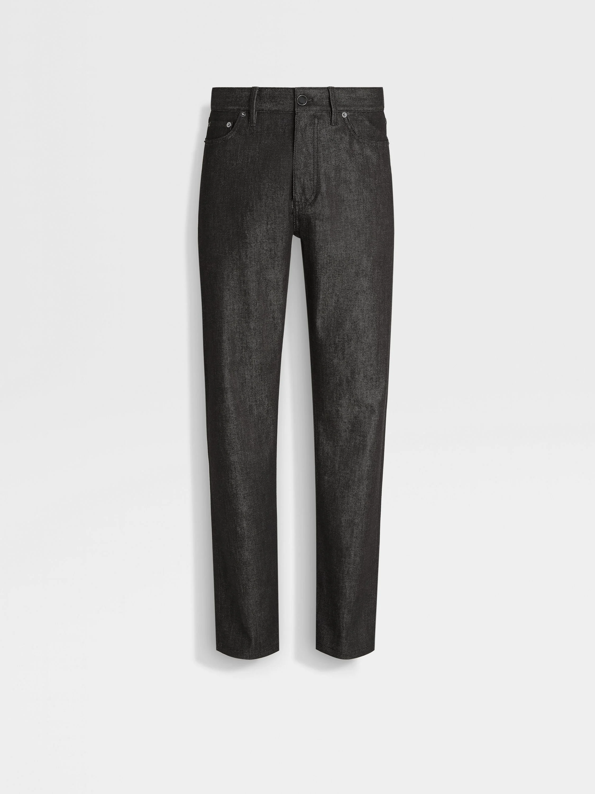 The black stretch cotton and cashmere Roccia jeans combine comfort and luxury. INFO Enhanced with a touch of stretch and the addition of brilliant, lightweight cashmere, the black cotton Roccia jeans are perfect for refined casual wear. The jeans include a built-in belt. They are styled with a contemporary, slim fit. ROCCIA ('rɔt:ʃa) — ITALIAN FOR 'ROCK' The inspiration for the Roccia Trousers was Born in Oasi Zegna — the home of our values in the Italian Alps. Inspired by classic workwear, they're both hardwearing and elegant, making them a reliable foundation to any look. PRODUCT CODE UEL99A8-CITYL-001 MATERIALS AND CARE Main body: 93% Cotton; 6% Cashmere; 1% Elastane Lining: 65% Polyester; 35% Cotton Do not wash. Do not bleach. Do not tumble dry. Iron at max 110°C. Professional dry cleaning in hydrocarbons, mild process. Wash separately. Wash inside out. FIT AND PRODUCT DETAILS • Slim fit • 17.5 cm narrow hem • Zip and button closure • 5-pockets style • Constructed belt • Denim weight: 10 ounces